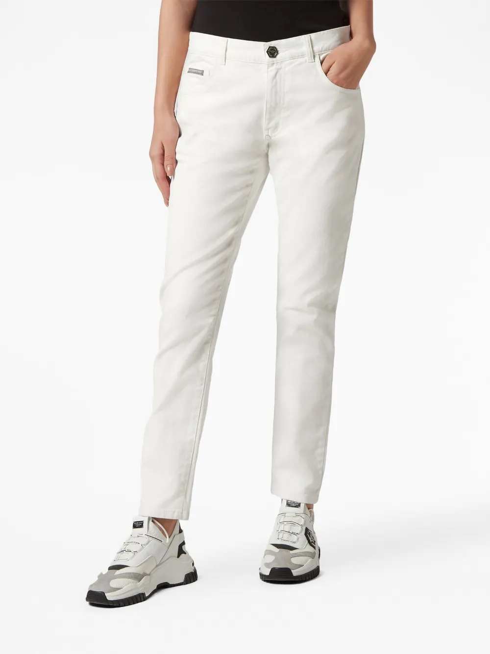 Белый, хлопок, деним, нашивка с логотипом сзади, петли для ремня, пять карманов и прямой крой.