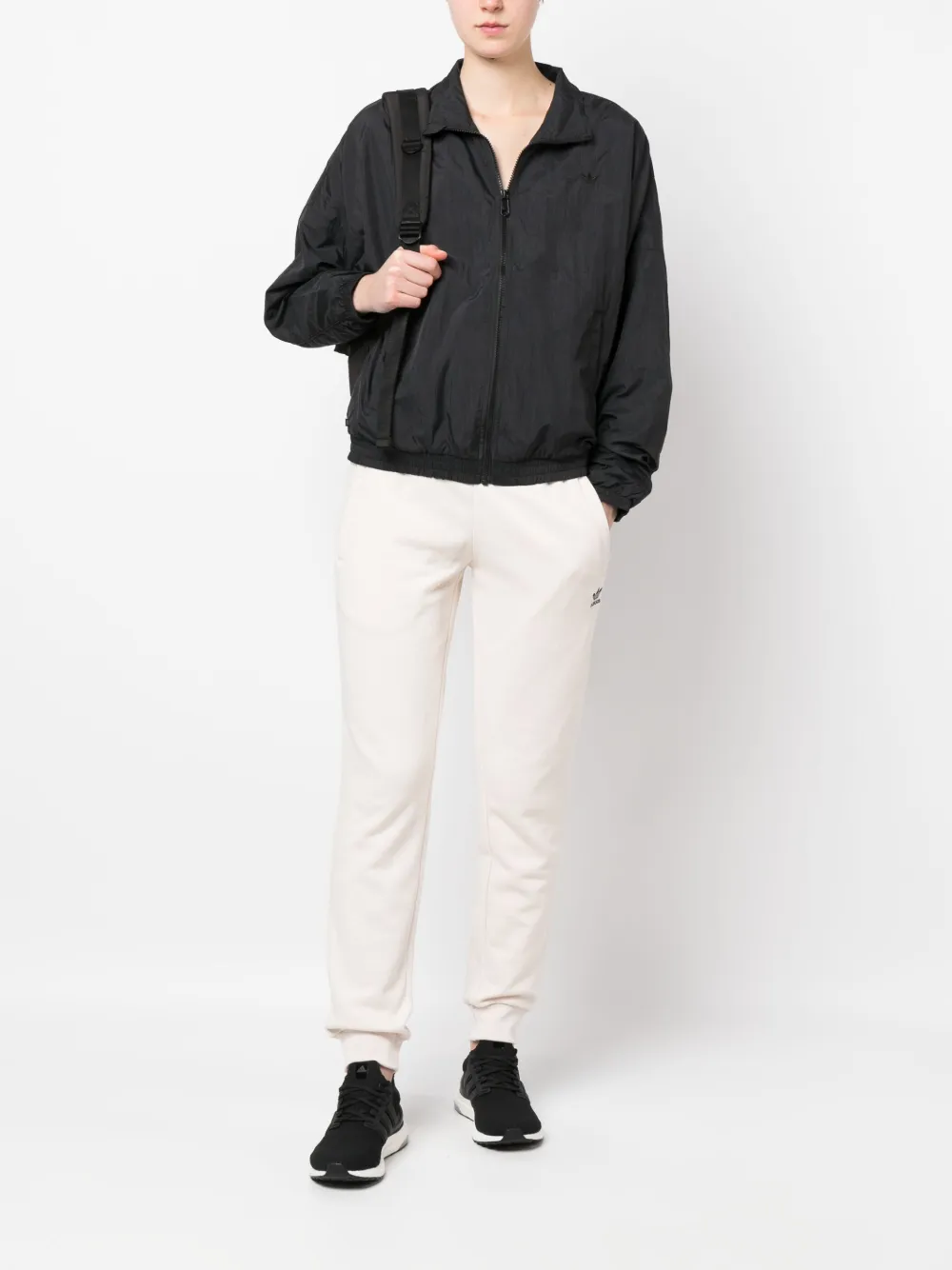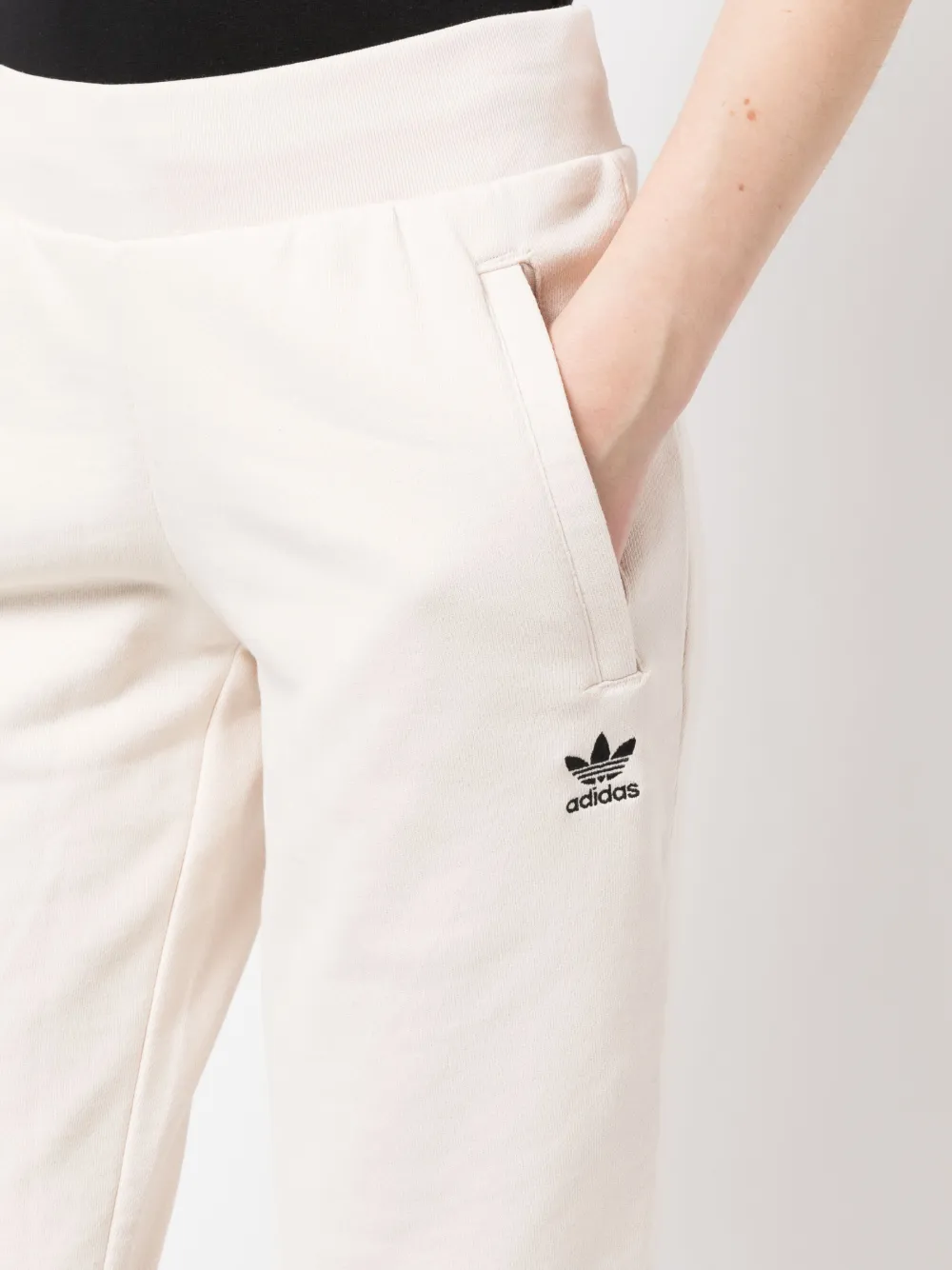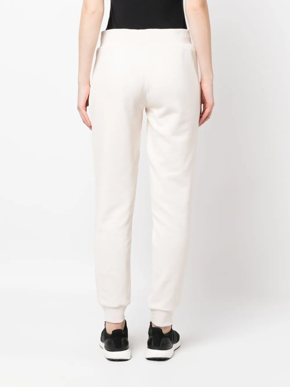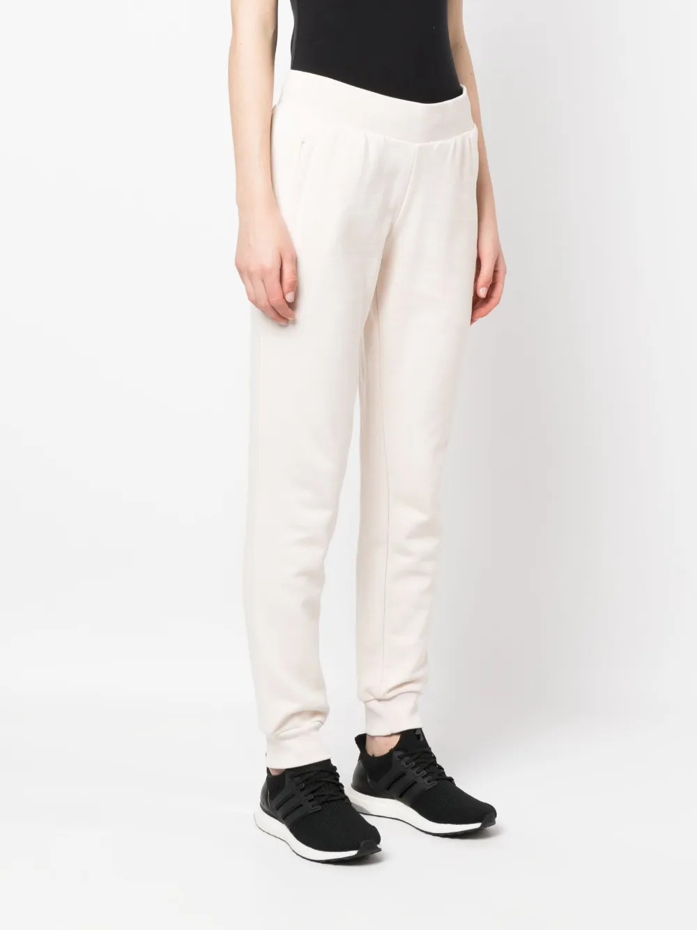 Белый, хлопок, ткань джерси, вышитый логотип спереди, низкая посадка, два прорезных кармана сбоку, пояс в рубчик и подол в рубчик.