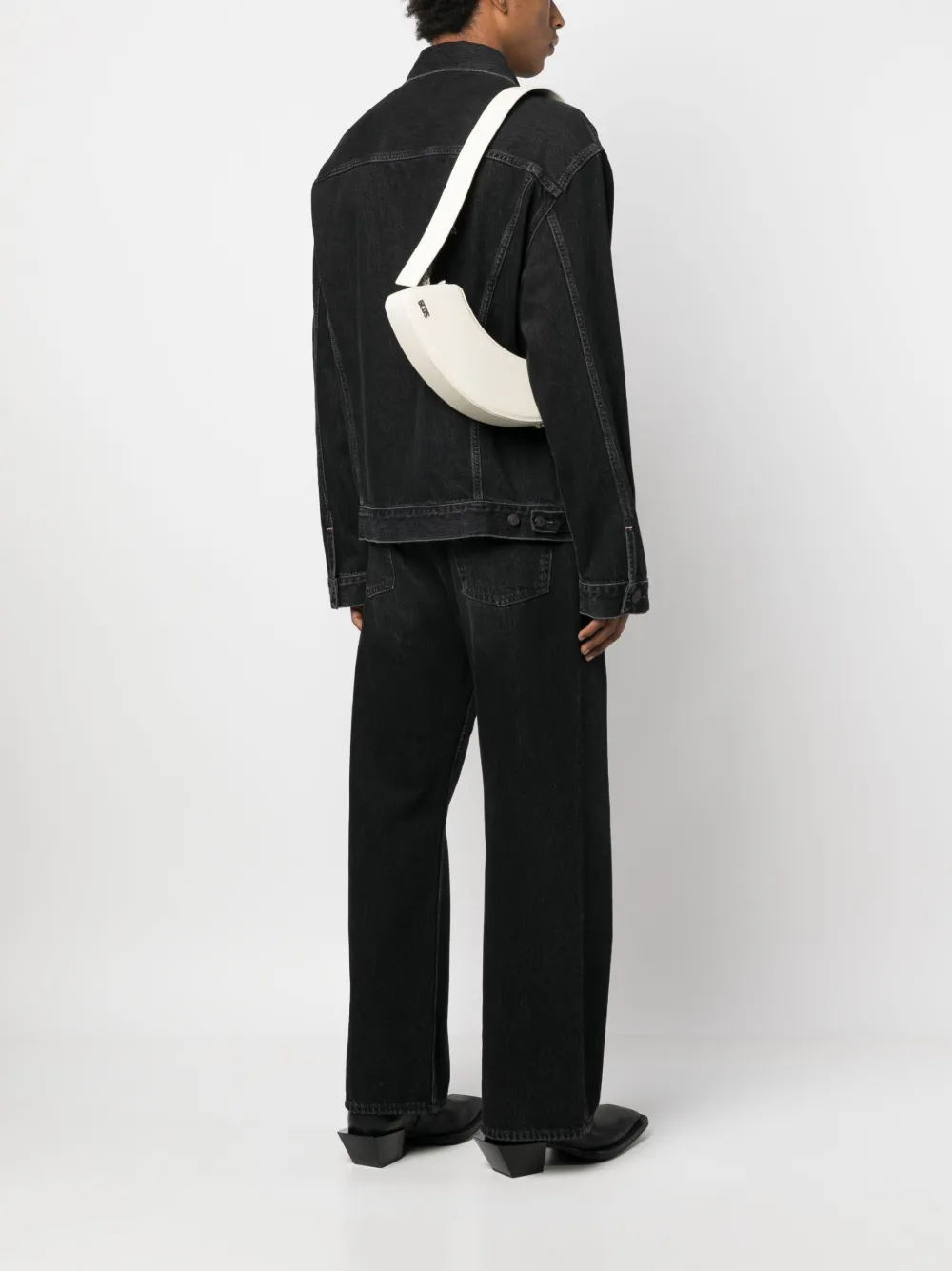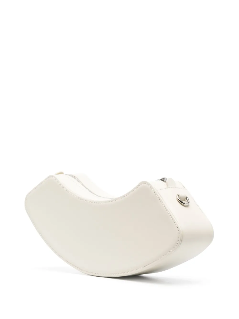 Кремовый, телячья кожа, гладкая текстура кожи, серебристый металлический логотип, подкладка с логотипом, застежка на молнии сверху, регулируемый ремень на плечо, внутренние отделения для карт и основное отделение.