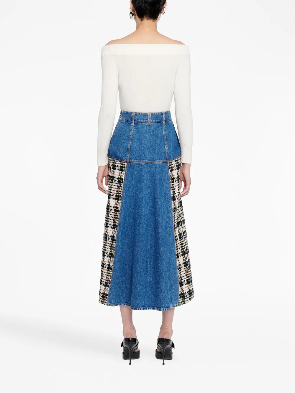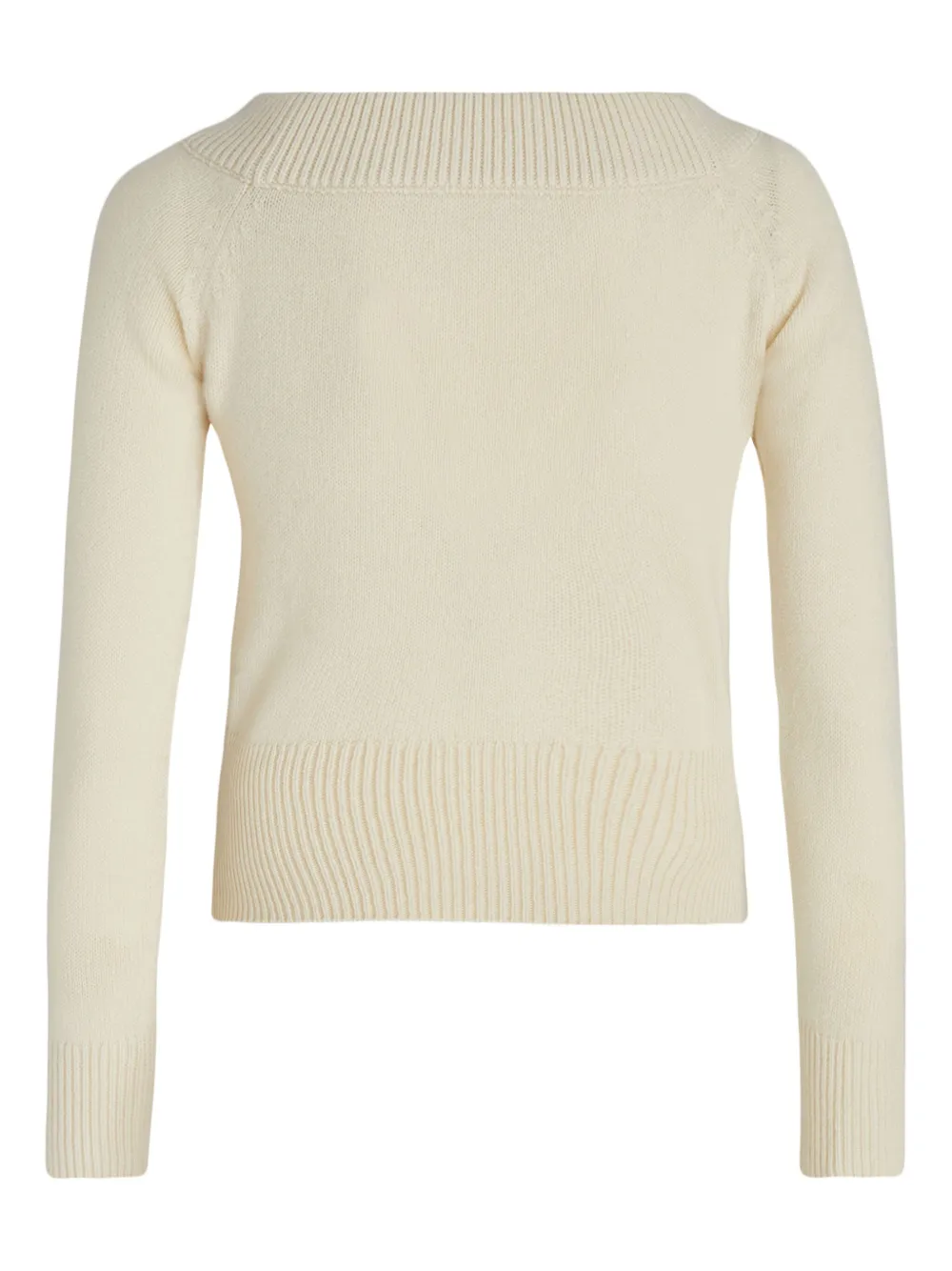 Цвет слоновой кости, смесь шерсти и мохера, вязаные края в рубчик, открытые плечи, длинные рукава и прямой подол.