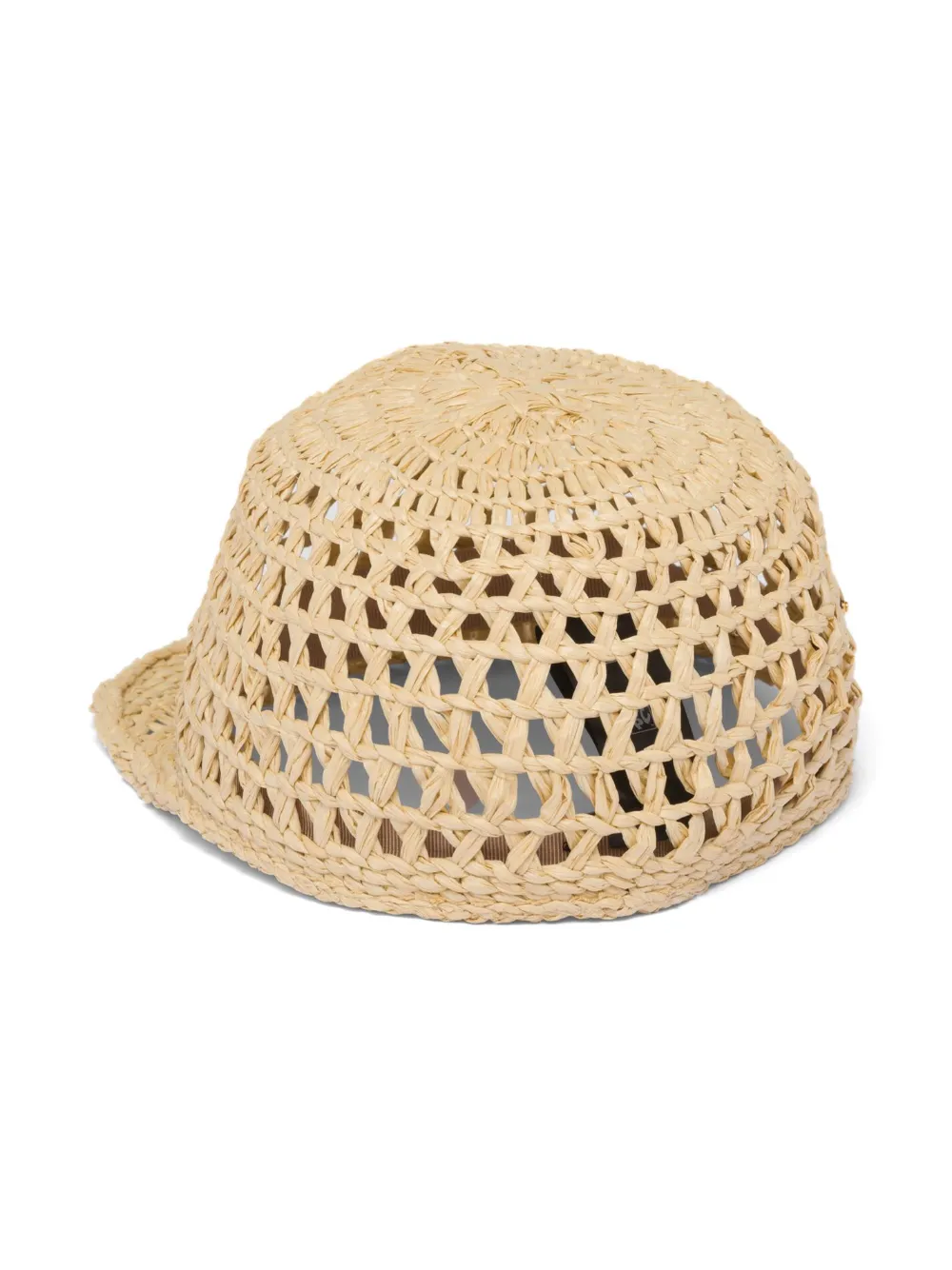 Светло-бежевый, рафия, переплетенный дизайн, треугольный эмалированный логотип, плоский козырек и узкие поля.