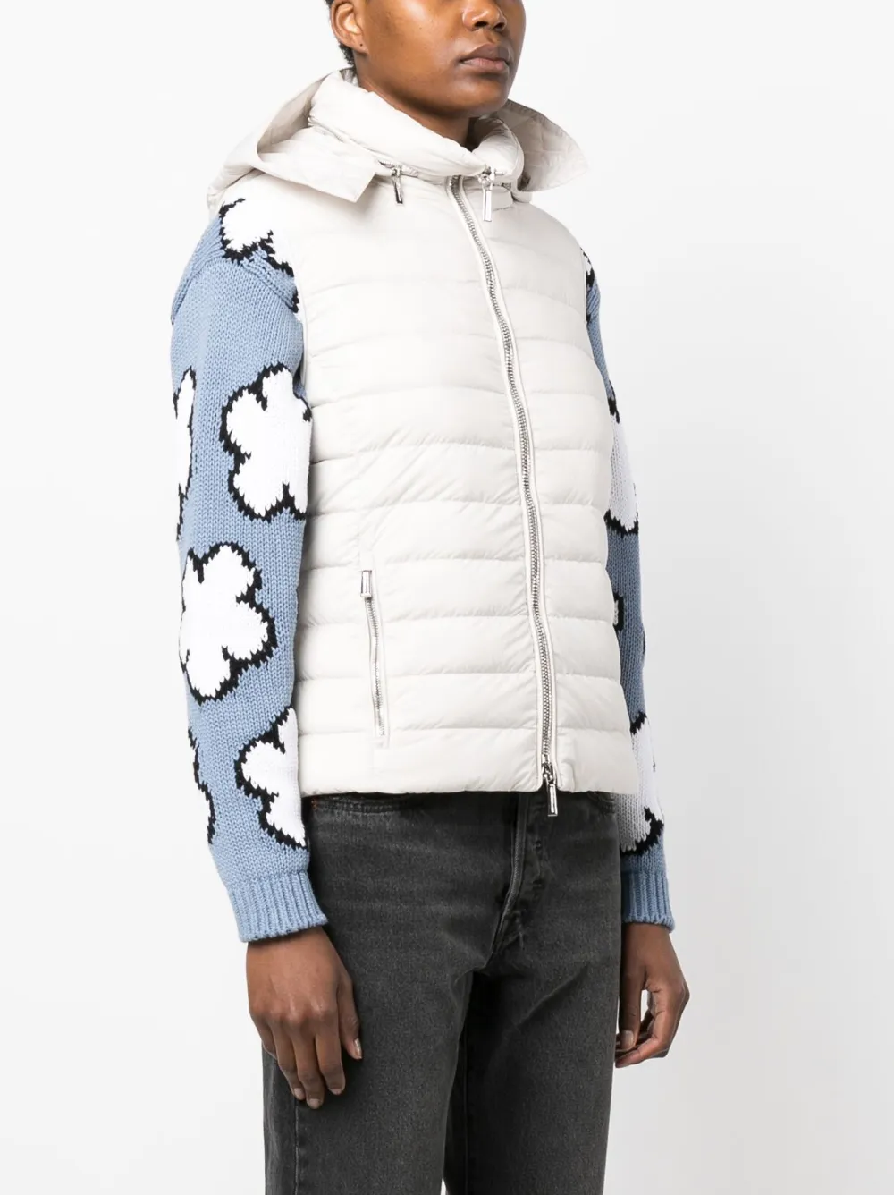 Цвет слоновой кости, дутый материал, съемный капюшон, круглый вырез, застежка на молнии спереди, без рукавов, передние карманы на молнии и прямой подол.