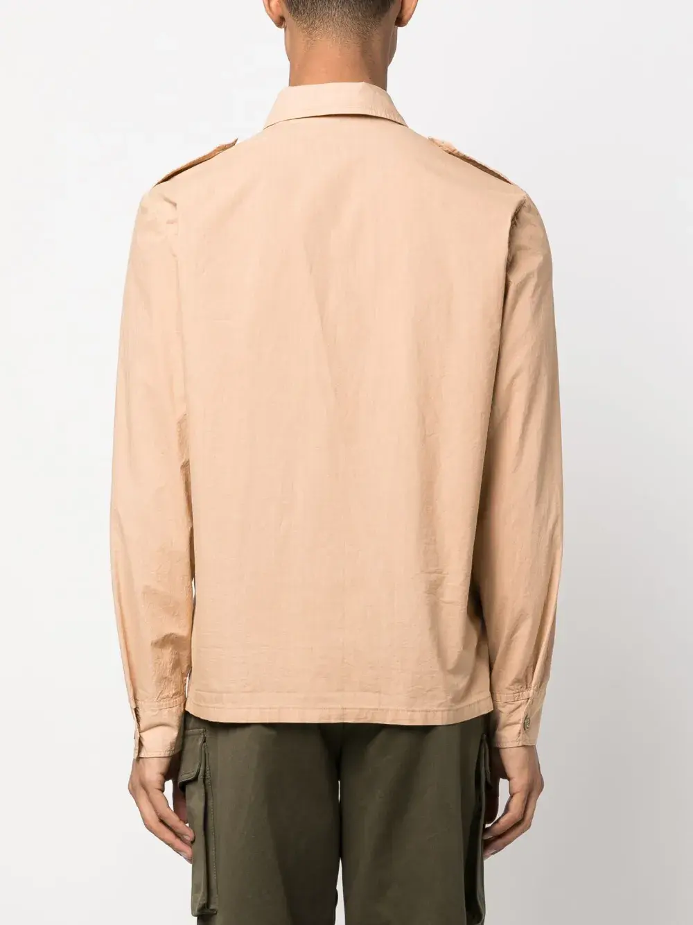 Светло-бежевый, хлопок, классический воротник, застежка на пуговицах спереди, длинные рукава, манжеты на пуговицах, два нагрудных кармана с клапанами и прямой подол.