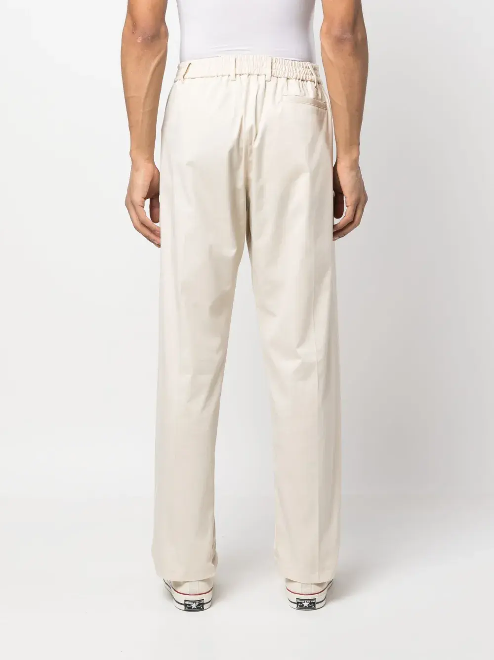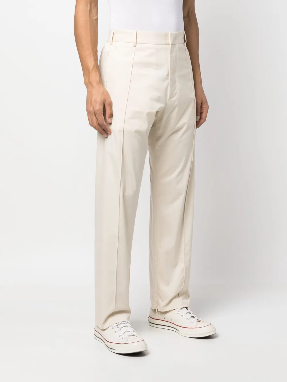 Светло-бежевый, смесовый хлопок, потайная застежка на молнии и пуговицах, эластичный пояс и прямой крой.