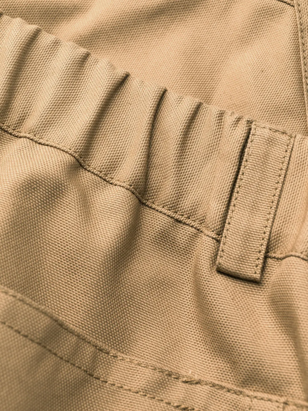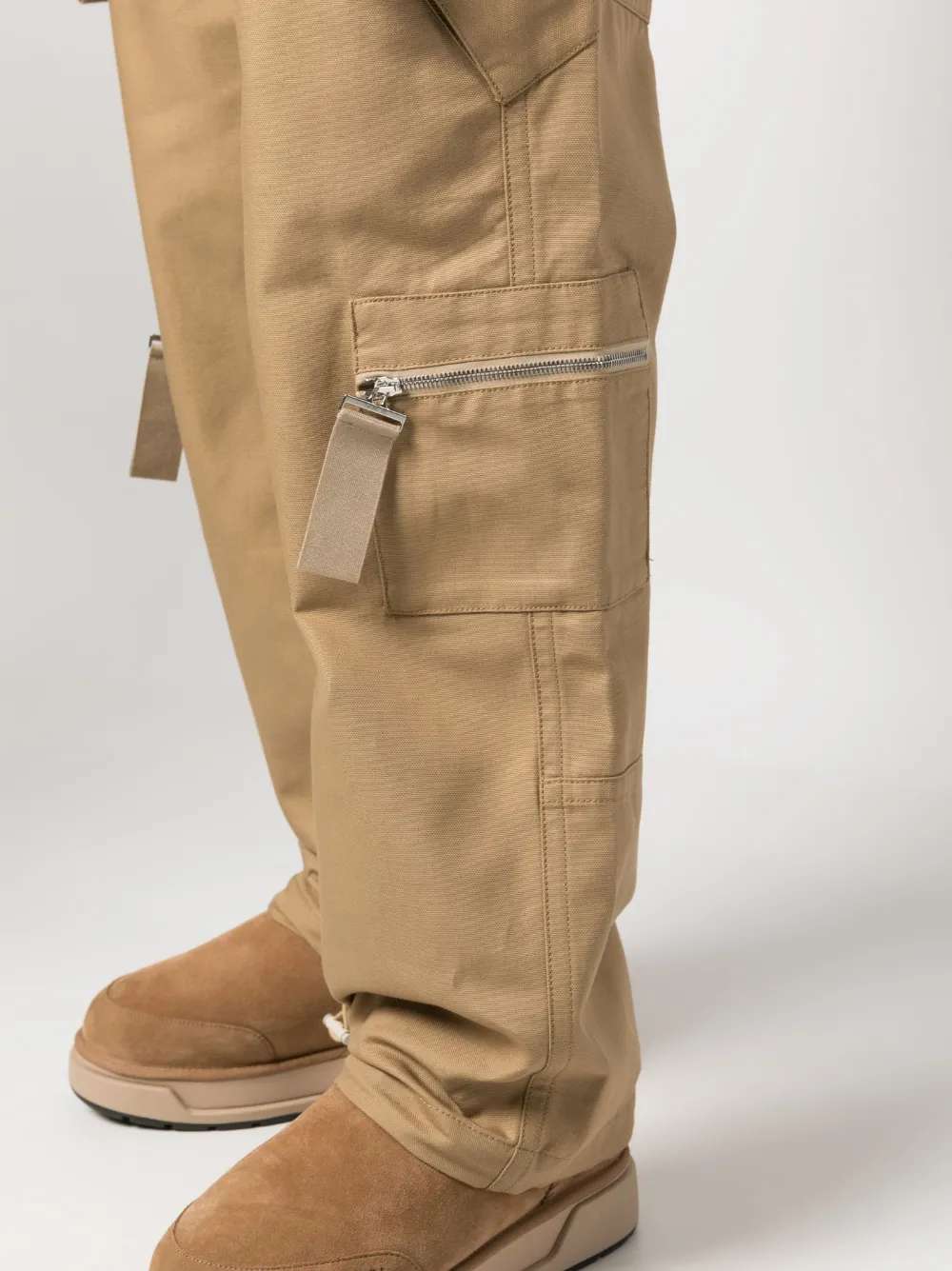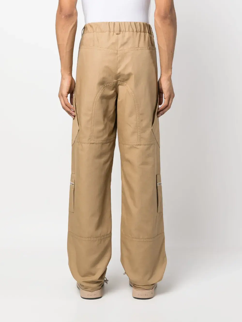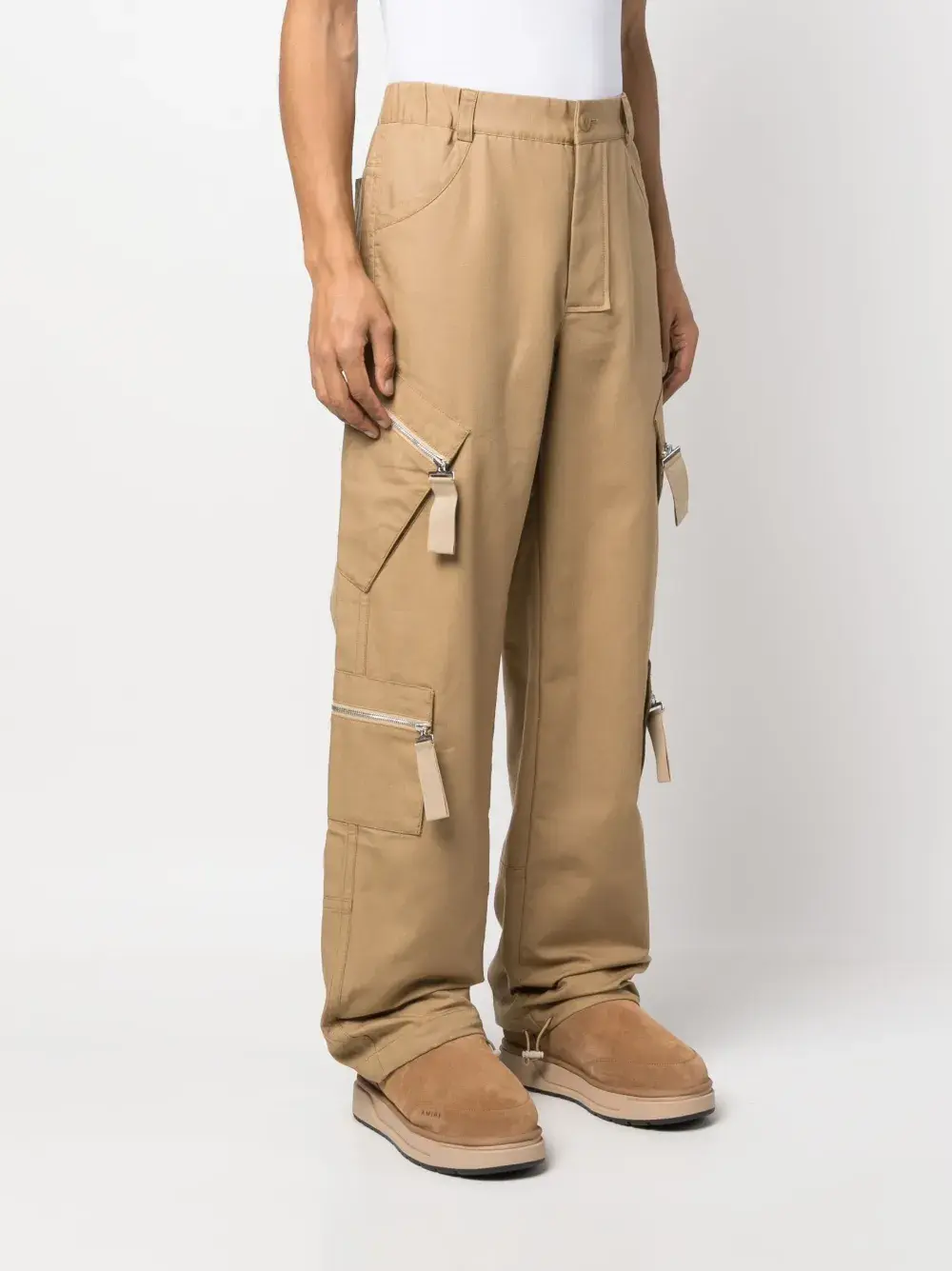 Бежево-коричневый, хлопок, накладные карманы, петли для ремня, застежка на молнии и пуговице спереди, прорезные карманы по бокам, прорезной карман сзади, прямой крой и манжеты с кулиской.