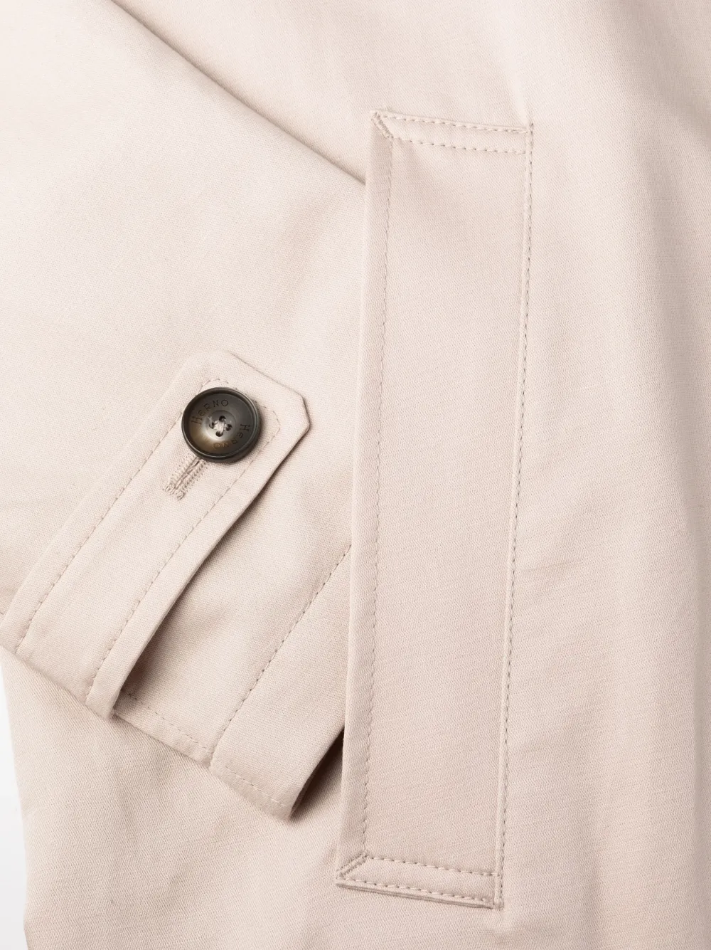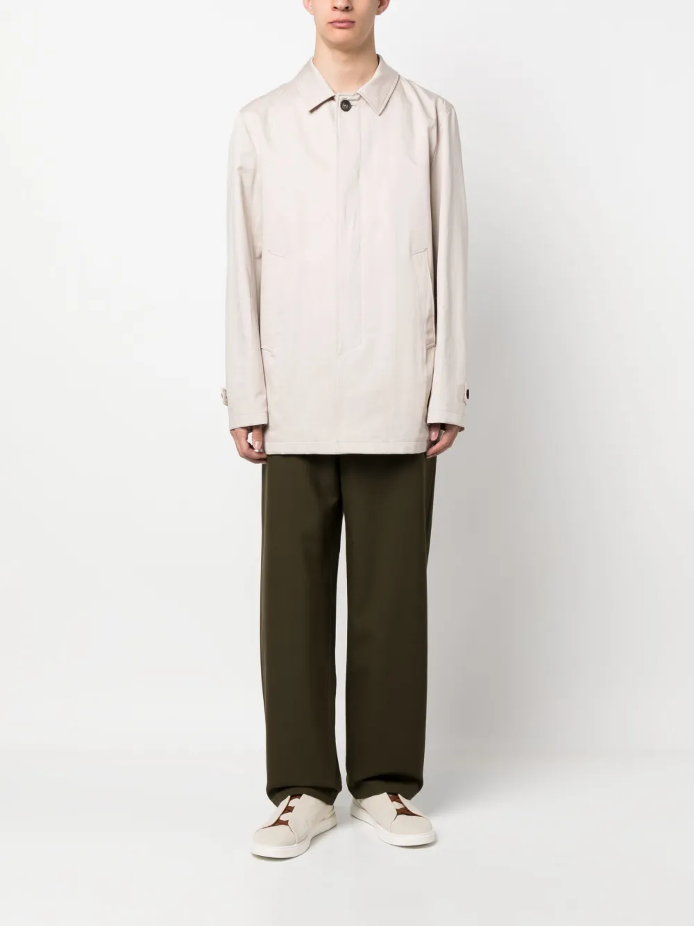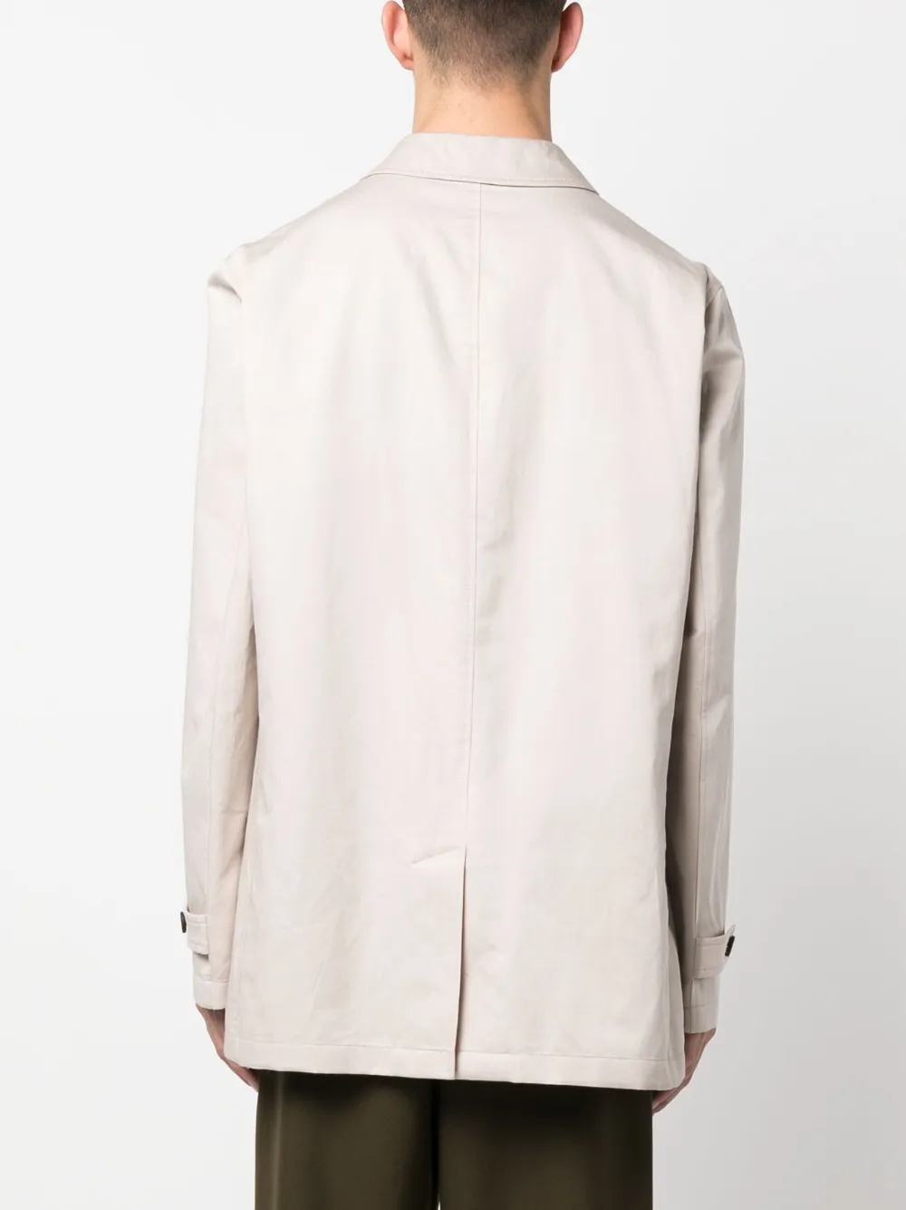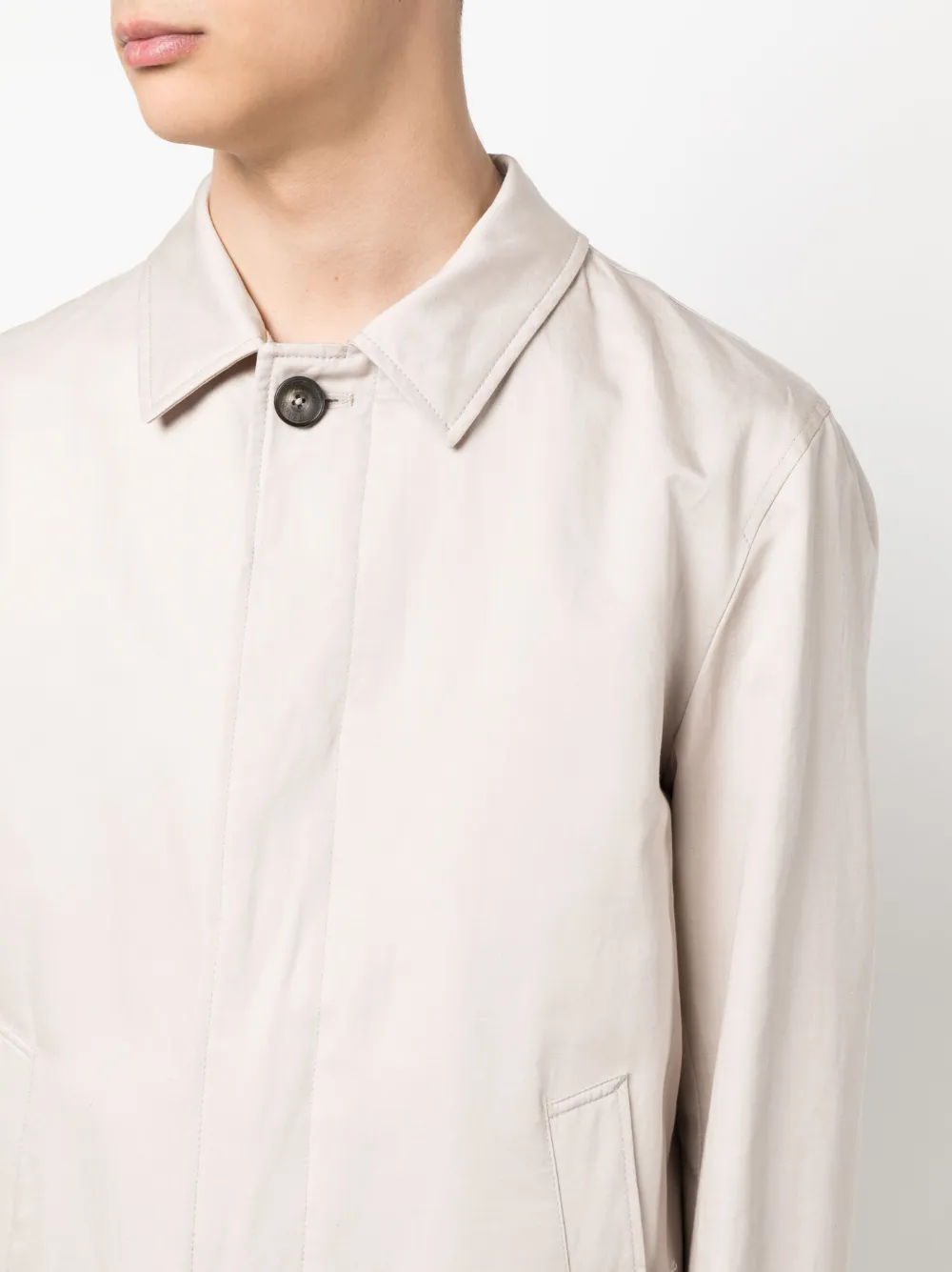 Кремово-белый, смесовый хлопок, классический воротник, потайная пуговичная застежка спереди, длинные рукава, два прорезных кармана по бокам, прямой подол, длина миди и шлица по центру сзади.