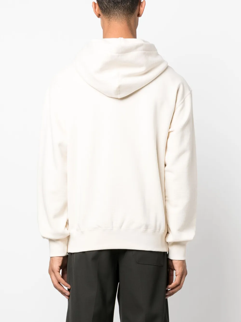Кремово-белый, хлопок, логотип спереди, длинные рукава, объемный капюшон на шнурке и прямой подол.