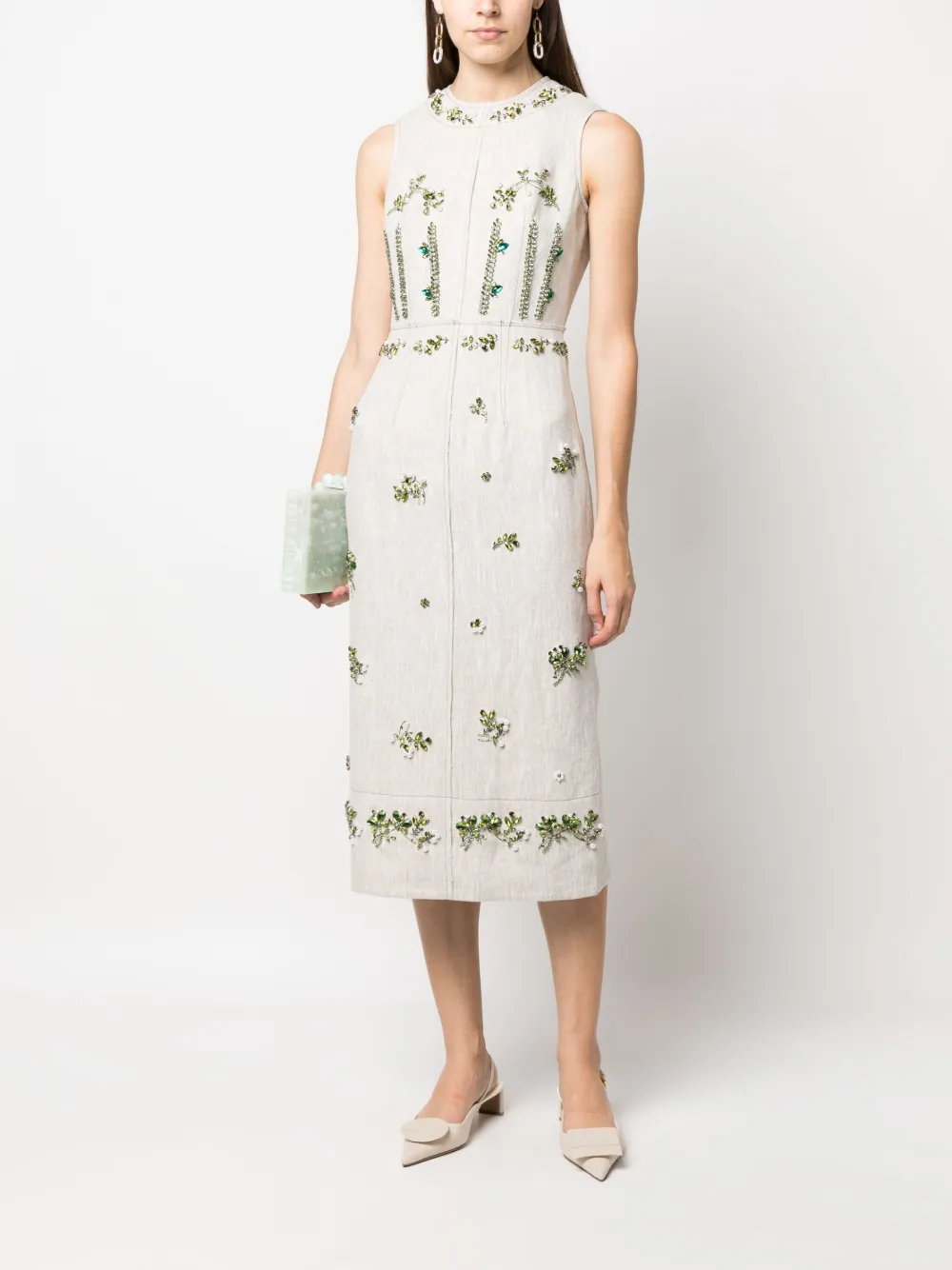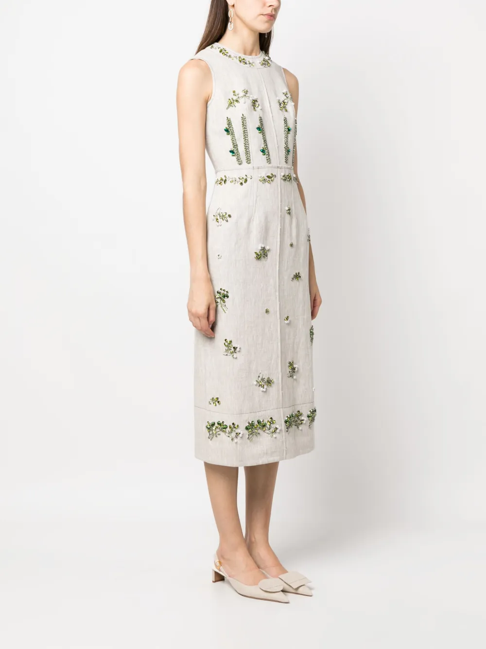 Экрю, разноцветный, лен, цветочная деталь, декор из бисера, круглый вырез, без рукавов, прямой подол и длина миди.