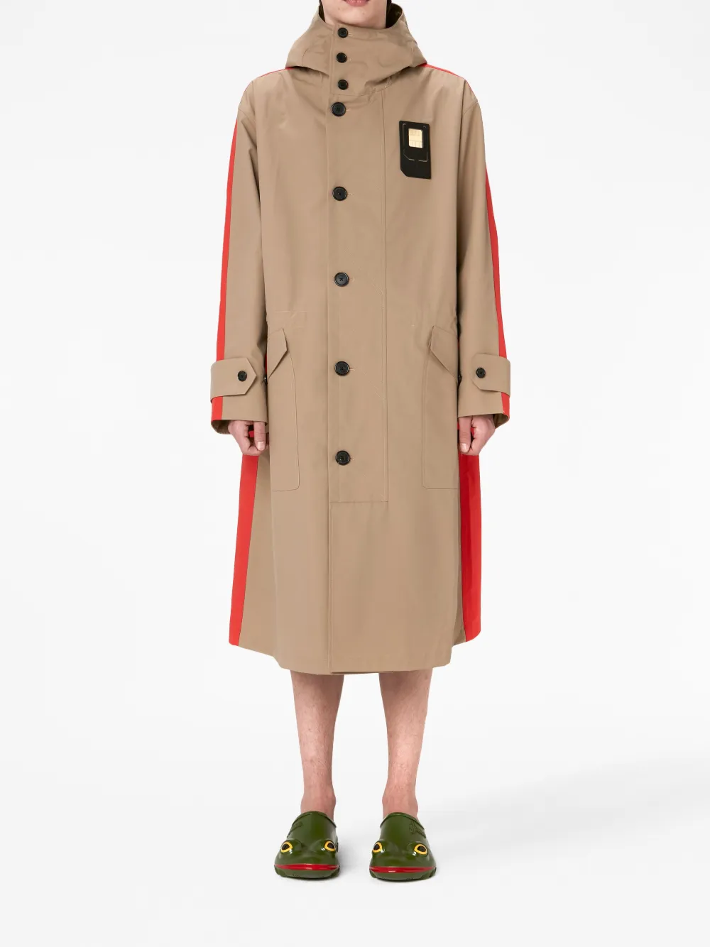 Бежевый, темно-оранжевый, стиль колор-блок, затягивающийся на шнурок капюшон, застежка на пуговицах спереди, длинные рукава, два передних кармана с клапанами и длина миди.