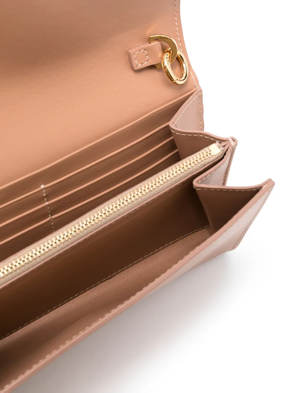 Бежево-коричневый, золотистый логотип, золотистая фурнитура, несколько отделений, откидной клапан, внутренние отделения для карт, внутренний карман на молнии и съемный верхний ремень-цепочка.