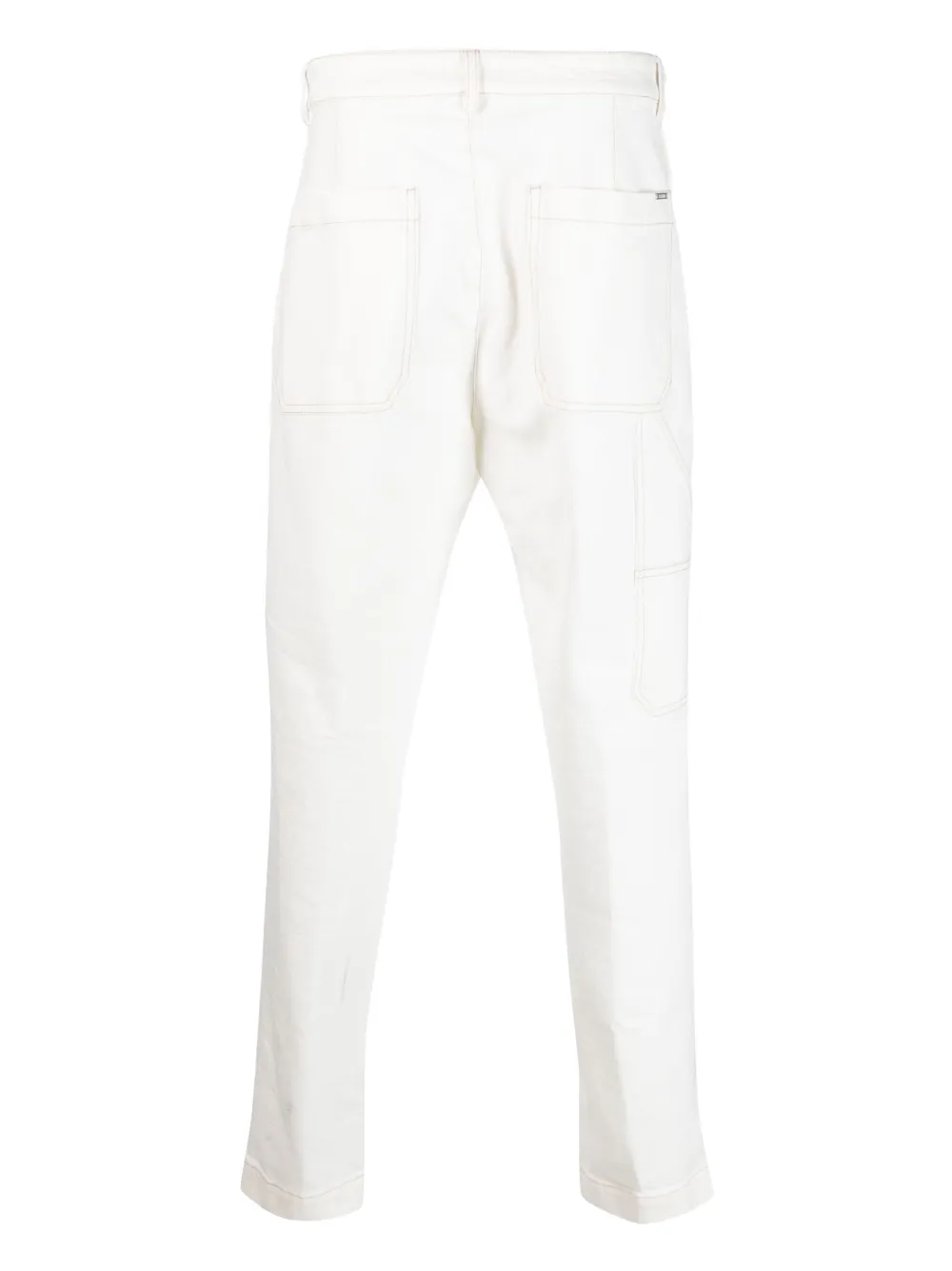 Белый, эластичный хлопок, петли для ремня, застежка на пуговицах спереди, два вшитых кармана по бокам, два накладных кармана сзади и прямой крой.