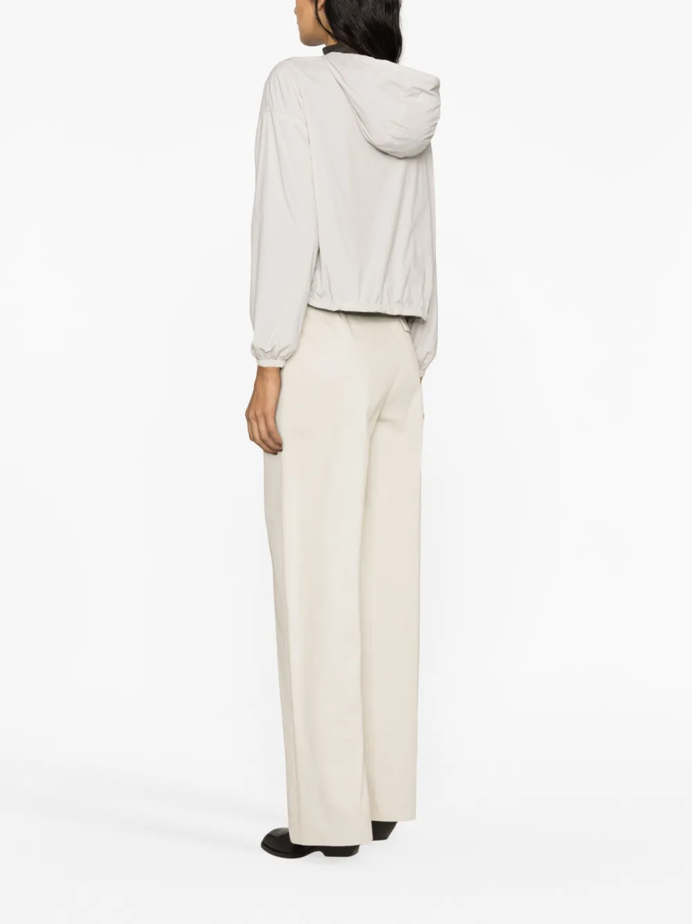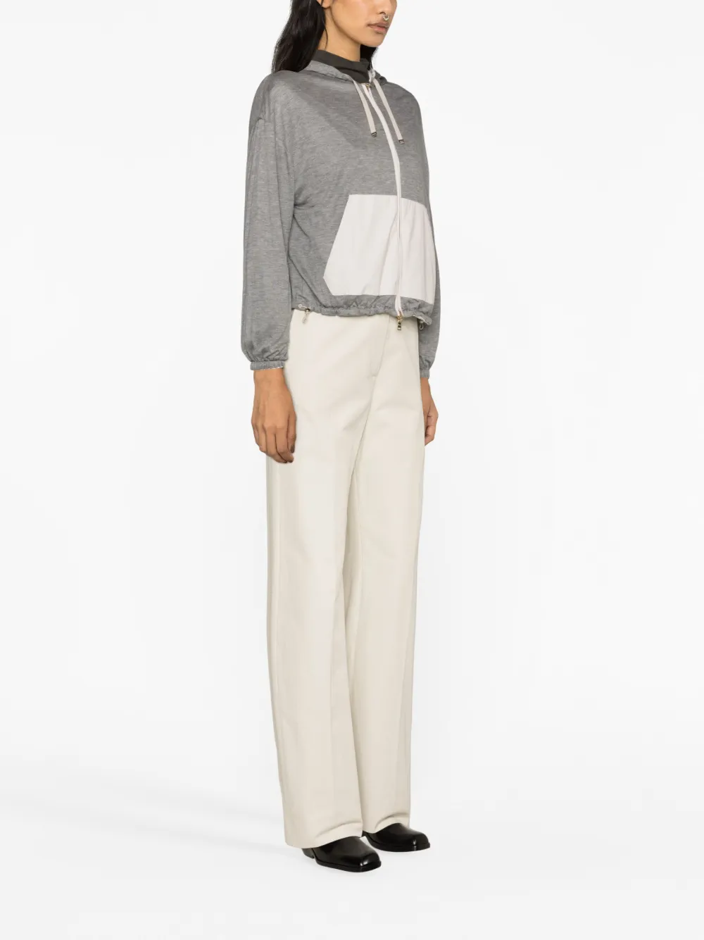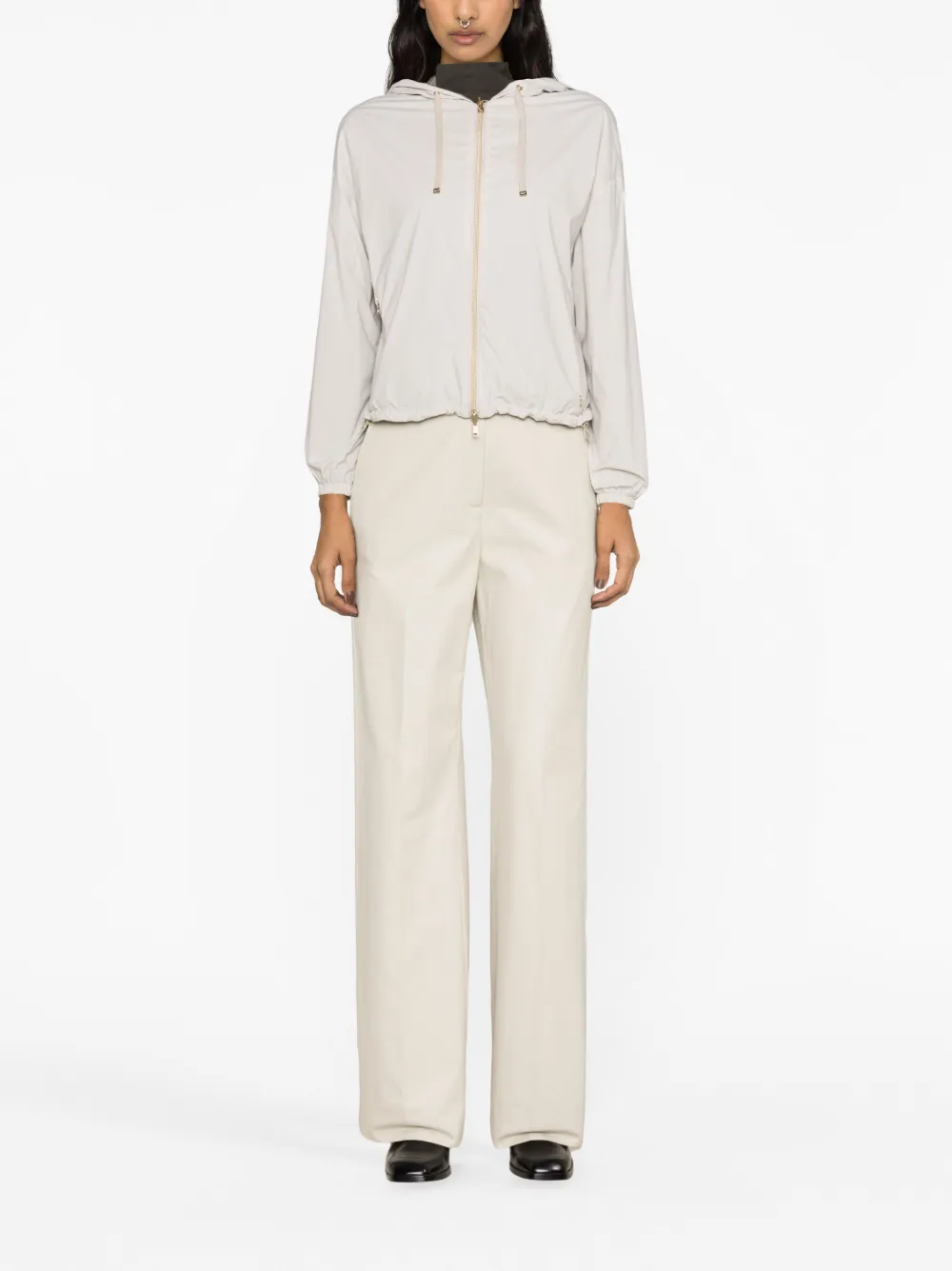 Кремовый, темно-серый, легкий материал, двусторонний дизайн, затягивающийся на шнурок капюшон, застежка на молнии спереди, длинные рукава, карман-муфта, карман на молнии сзади, эластичные манжеты, эластичный подол и прямой подол.