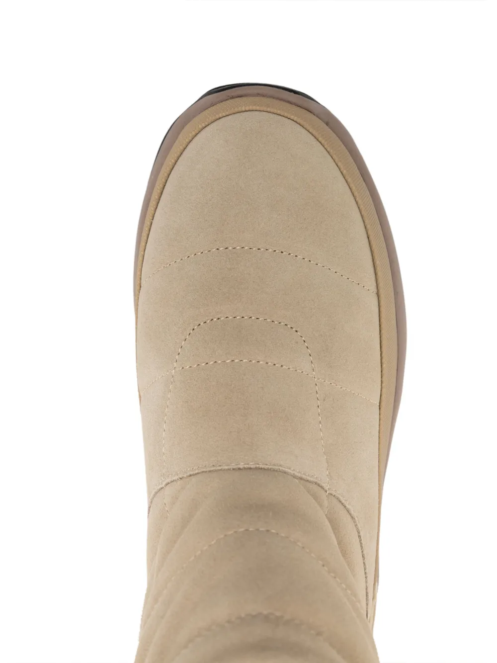 Бежевый, замша из телячьей кожи, дутый материал, вставки, логотип сбоку, нашивка с логотипом сбоку, стелька с логотипом, закругленный носок, верхняя застежка на шнурке, массивная резиновая подошва и высота по щиколотку. Это унисекс-модель. Обратите внимание, что для нее используется мужская размерная сетка.