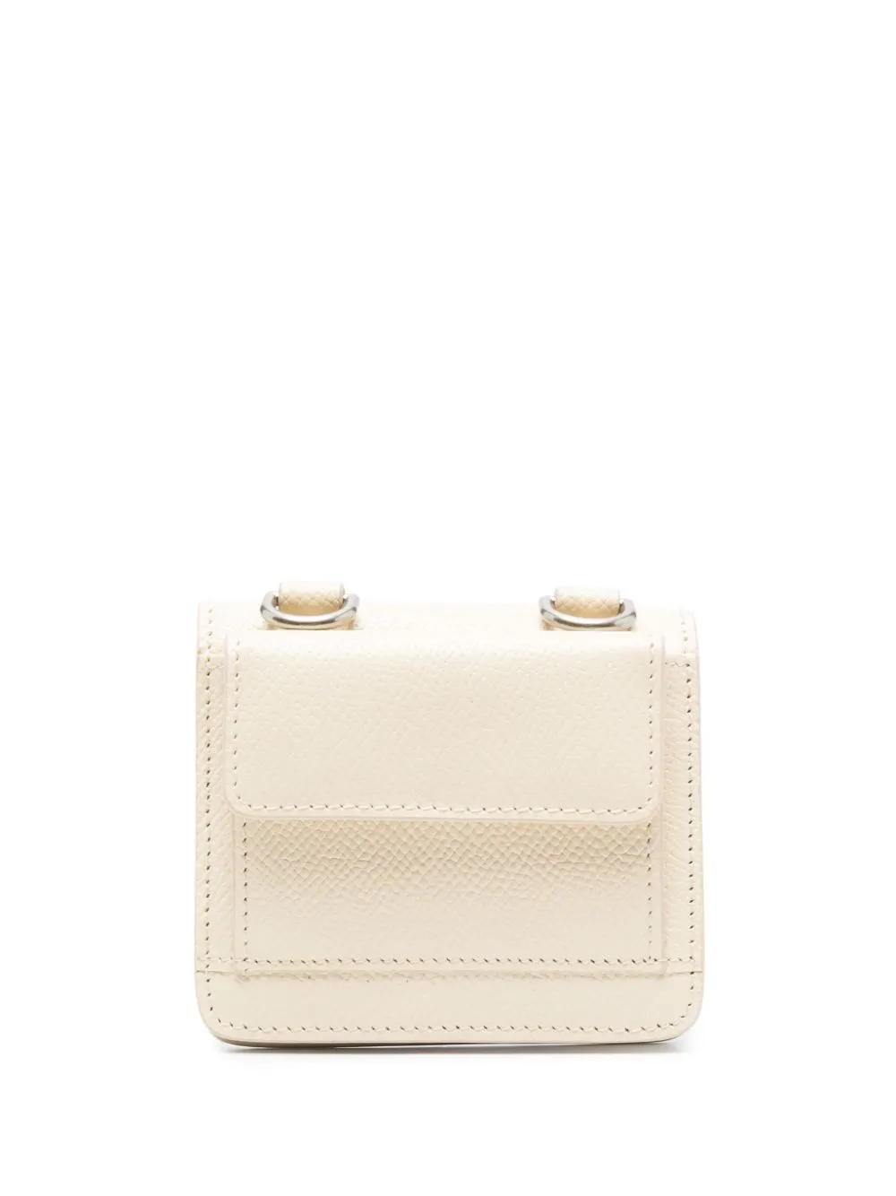 Цвет слоновой кости, телячья кожа, зернистая текстура, строчка в тон, два сложения, знаковая монограмма Ami de Coeur, тисненый логотип спереди, откидной клапан, съемный ремень на плечо, тисненый логотип внутри и внутренние отделения для карт.