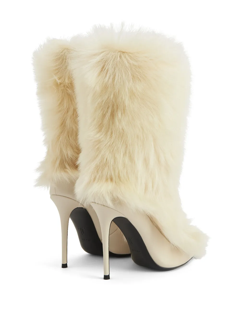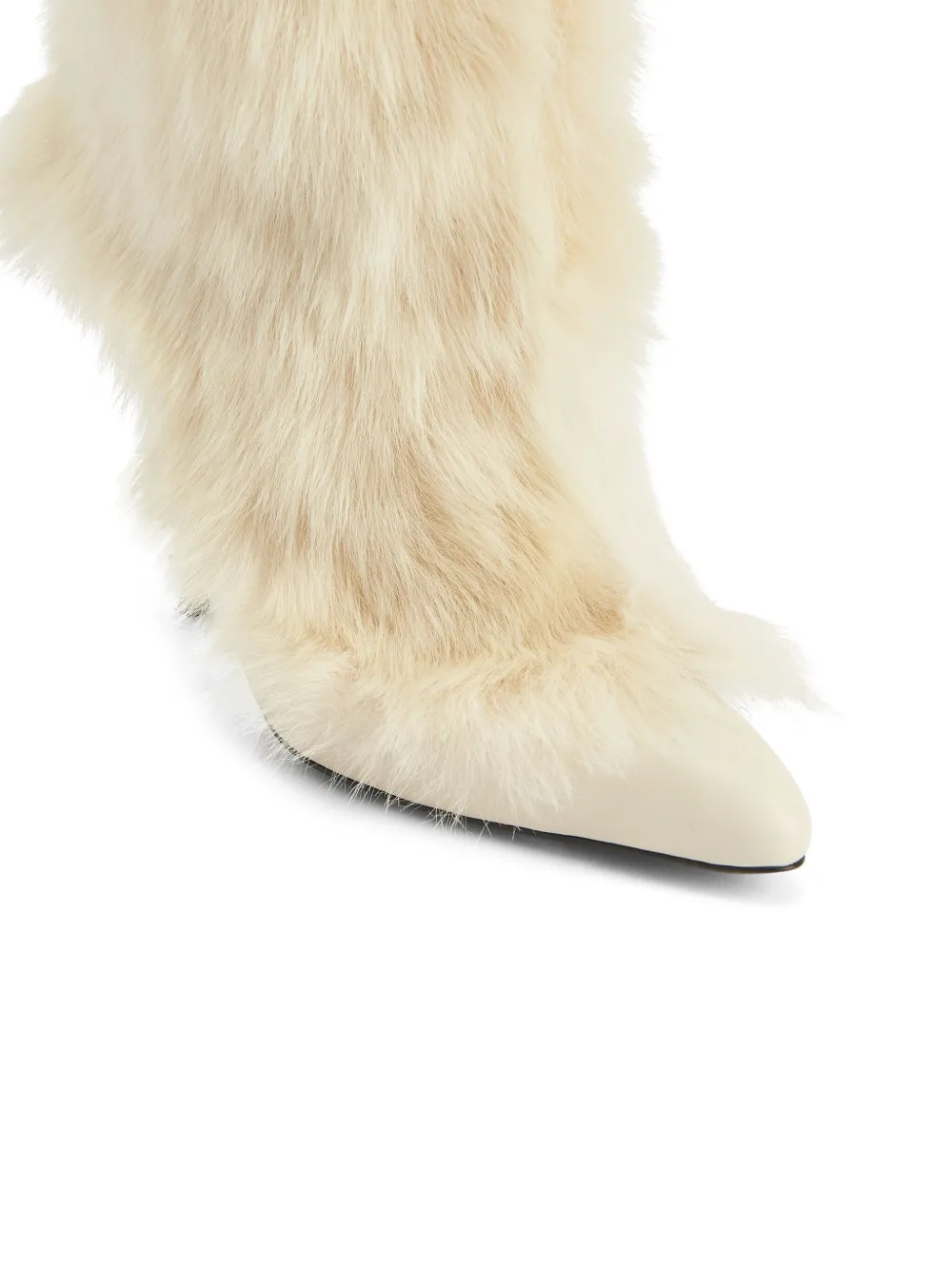 Кремово-белый, кожа, модель без застежки, овчина, заостренный носок и высокий каблук.