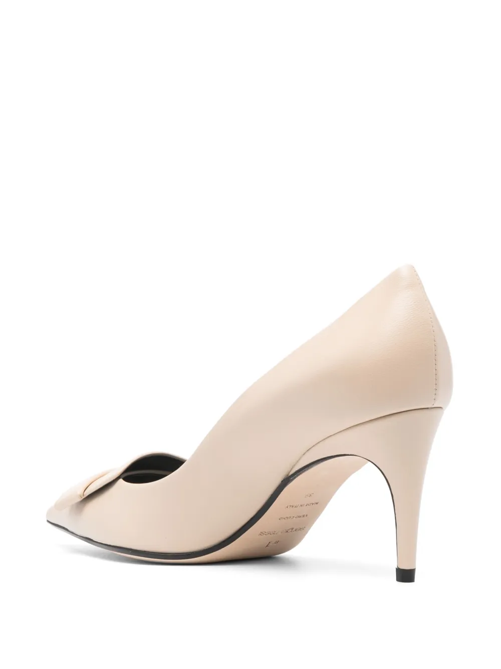 Светло-бежевый, телячья кожа, гладкая текстура кожи, логотип в тон, заостренный носок, модель без застежки, стелька с логотипом и каблук на высокой шпильке.