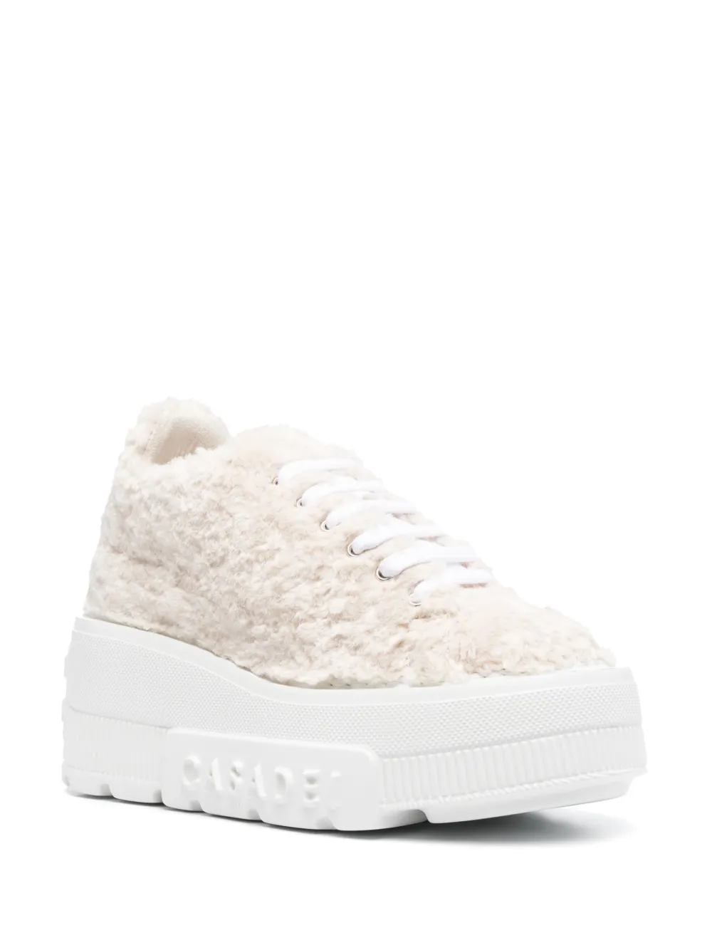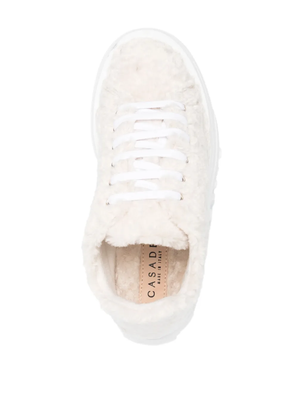 Кремово-белый, материал c флисовой текстурой, закругленный носок, шнуровка спереди, тисненый логотип сбоку, стелька с логотипом, задник с логотипом и плоская платформа.