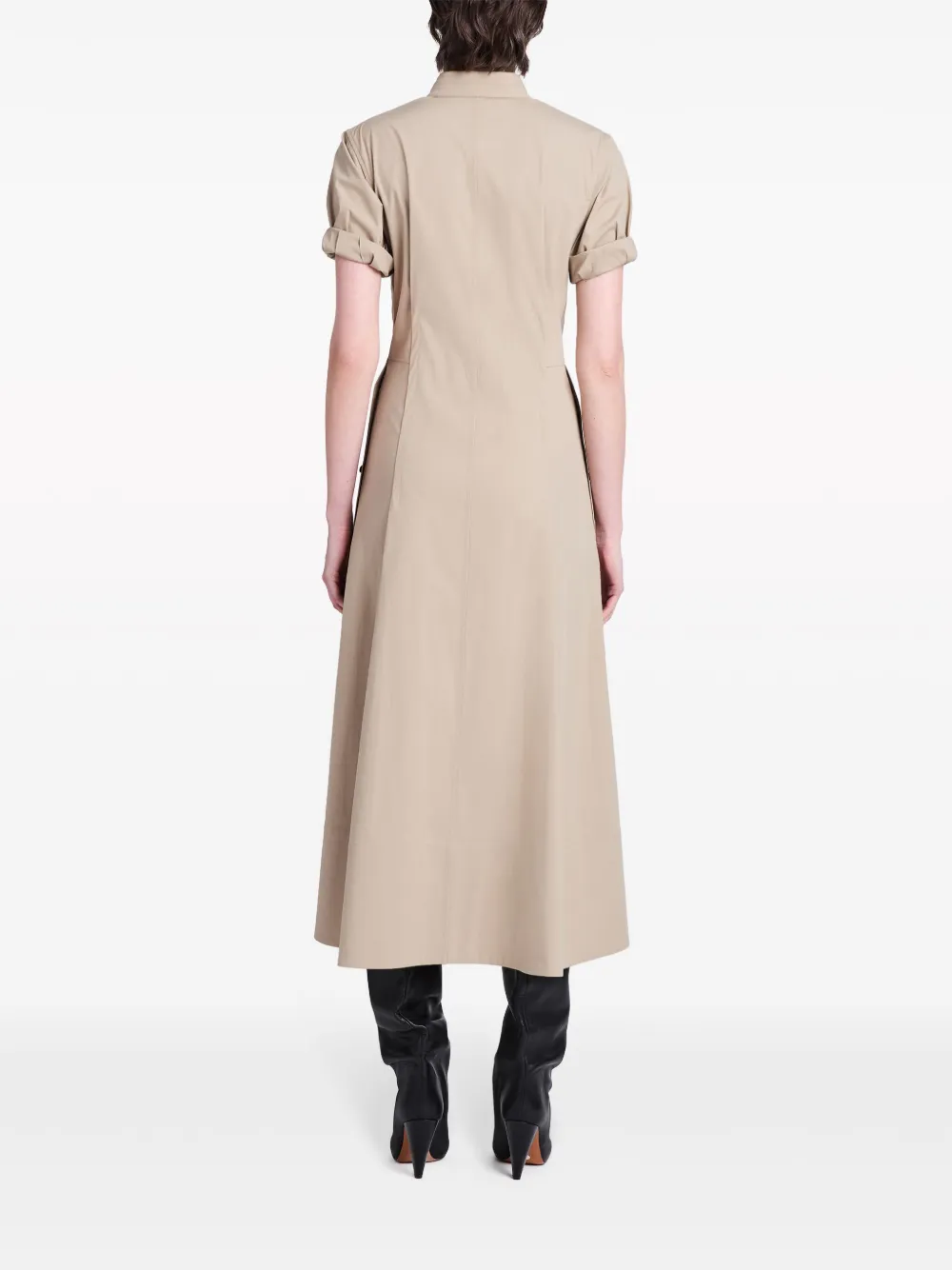 Расцветка Light Brown, эластичный хлопок, саржевое переплетение, складки, воротник-стойка, потайная пуговичная застежка спереди, короткие рукава, подвернутые манжеты, приталенный силуэт, юбка А-образного силуэта и длина миди.
