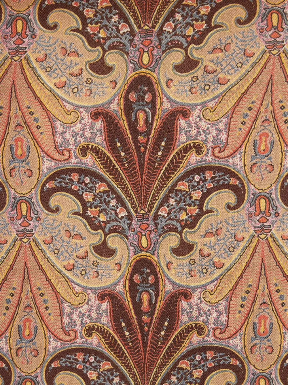 Красно-коричневый, разноцветный, смесь шерсти и шелка, принт пейсли, классический воротник, застежка на пуговицах спереди, ремень на талии, длинные рукава и длина по колено.