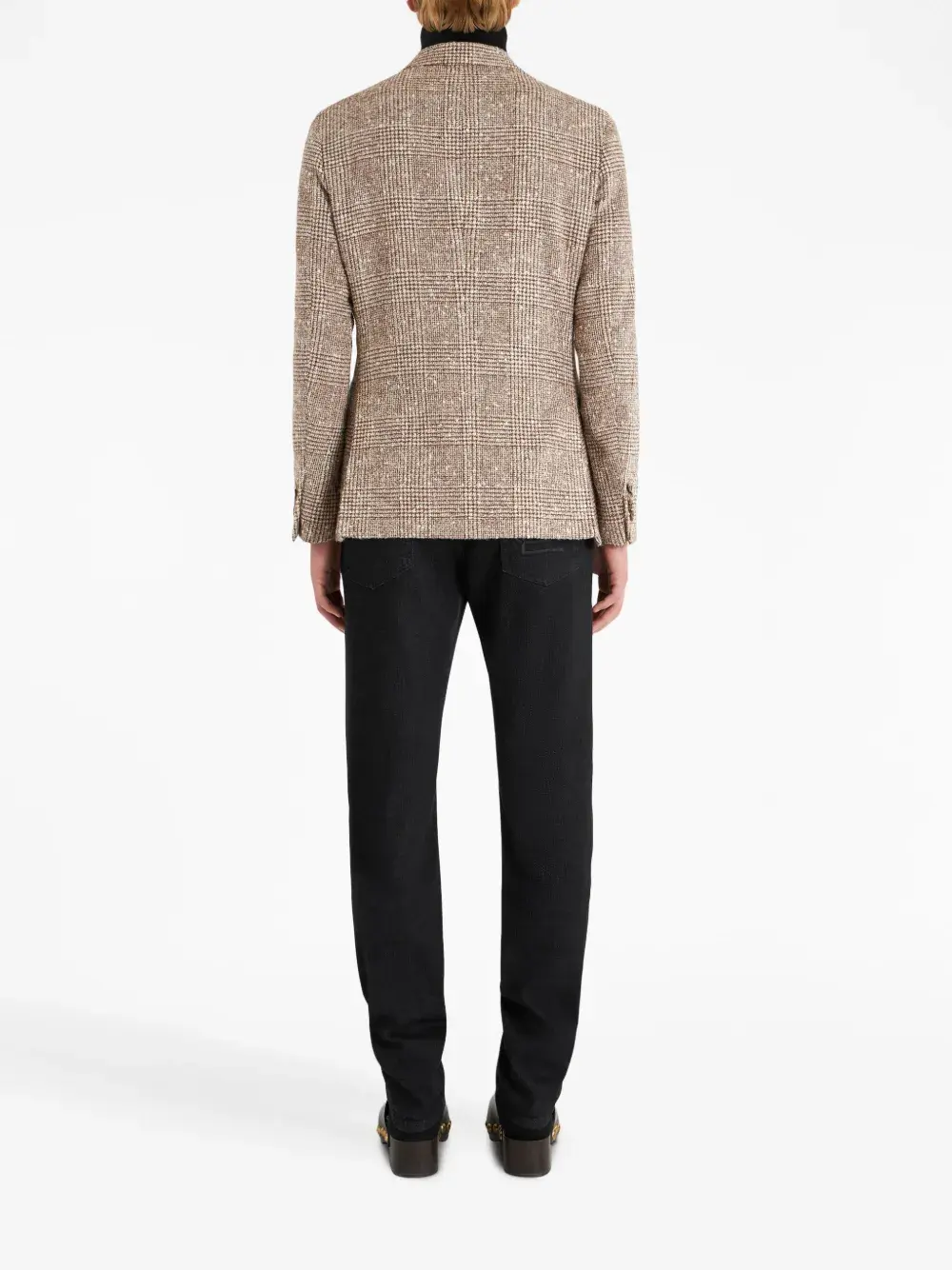 Смесовая шерсть альпаки, клетчатый узор, зазубренные лацканы, застежка на пуговицах спереди, длинные рукава, рукава с манжетами на пуговицах, прорезной карман на груди, два передних кармана с клапанами, две боковые шлицы сзади и цельная подкладка.