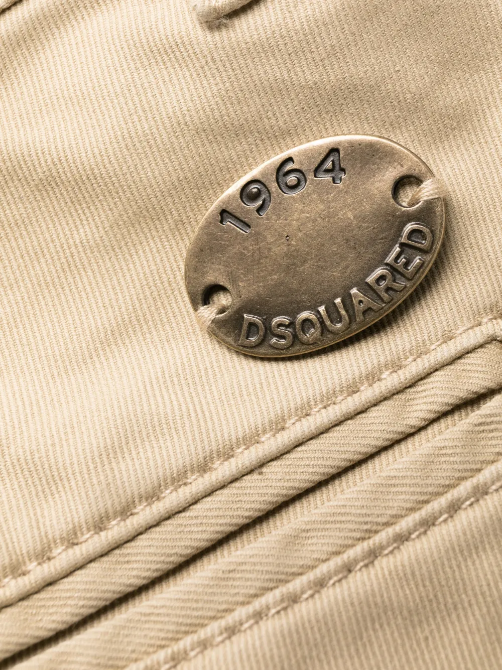 Бежевый, эластичный хлопок, металлический логотип бронзового оттенка, петли для ремня, потайная застежка на молнии и пуговицах, накладные карманы, два вшитых кармана по бокам, два прорезных кармана на пуговицах сзади, зауженный крой и укороченная длина.
