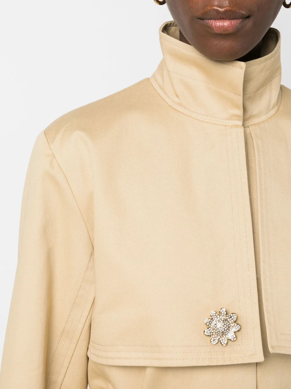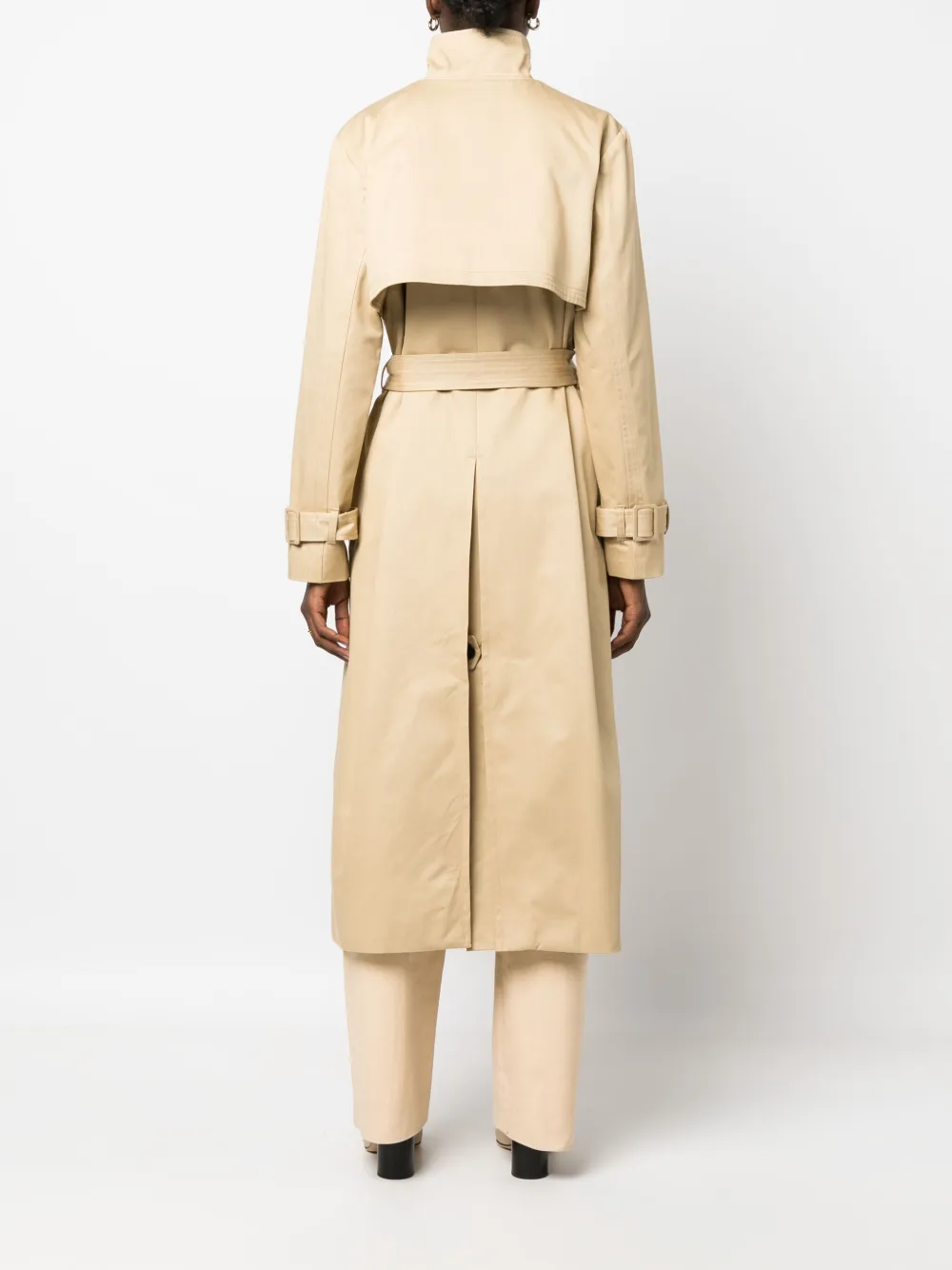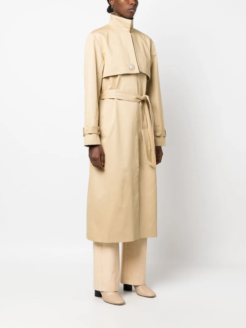 Песочно-бежевый, хлопок, декоративная брошь, воротник-стойка, потайная застежка спереди, ремень на талии, длинные рукава, штормовая заслонка, два вшитых кармана по бокам, шлица по центру сзади и длинная модель.