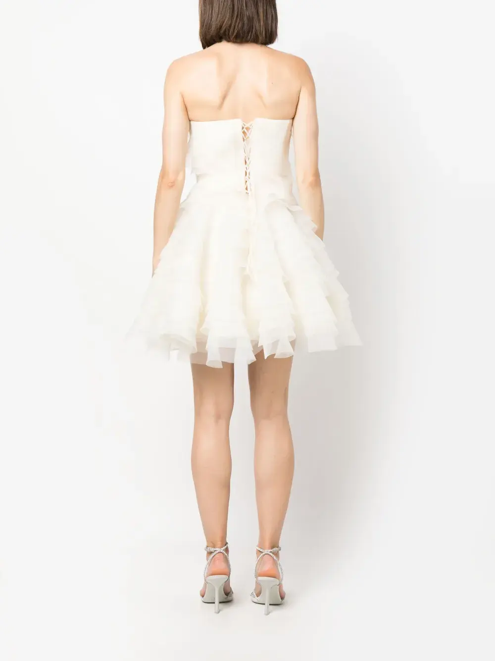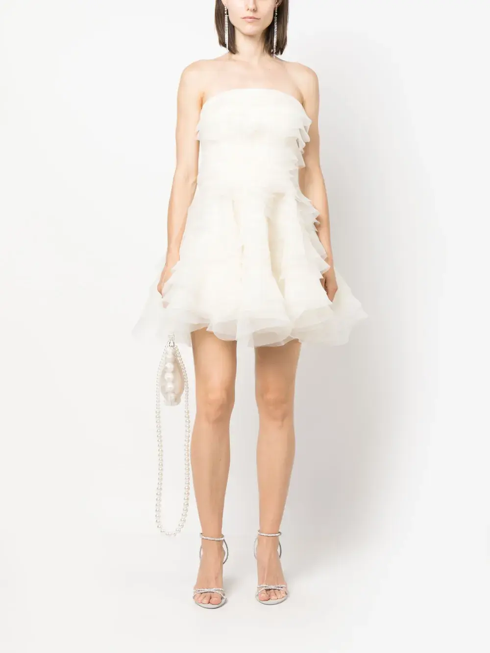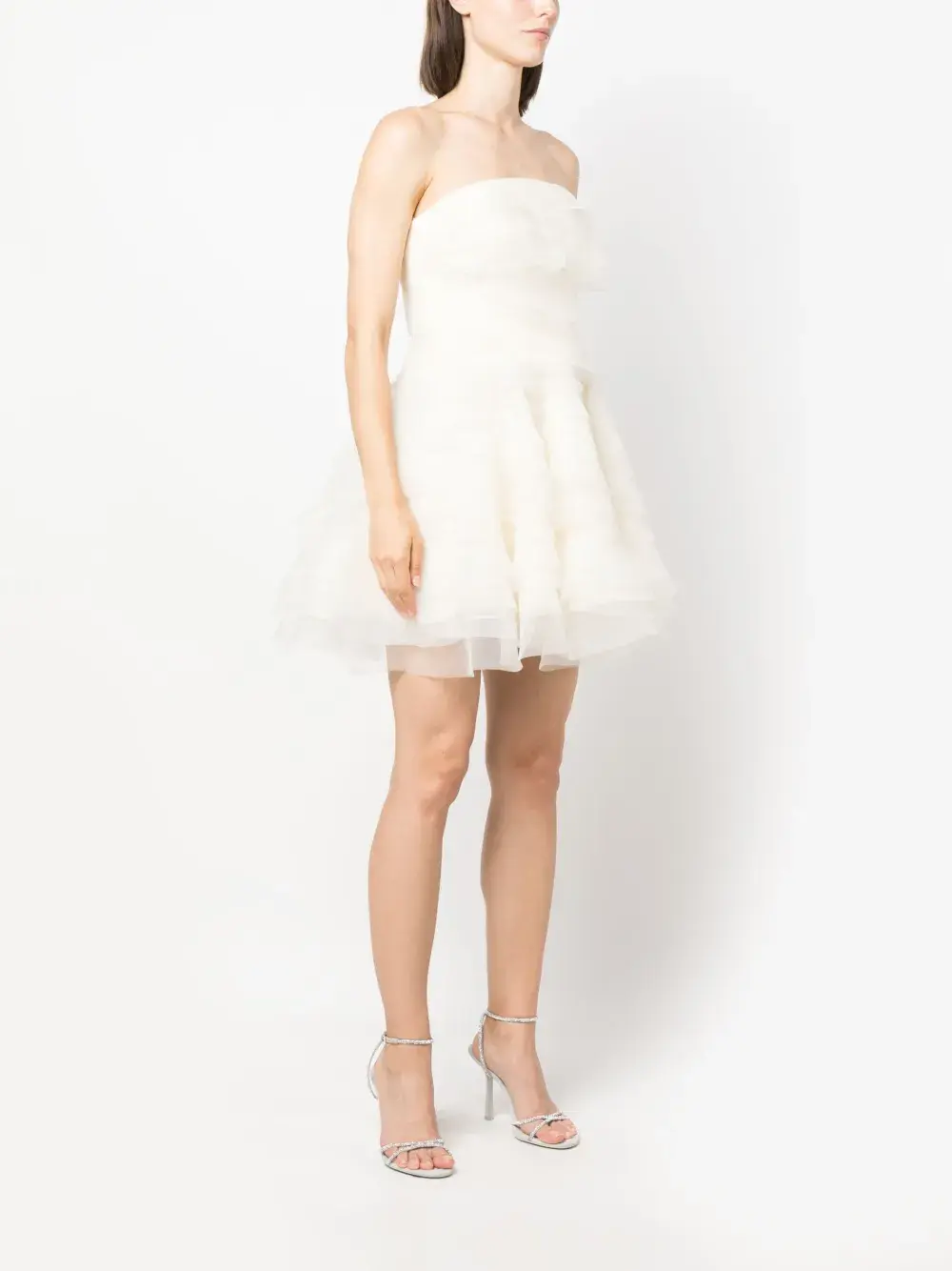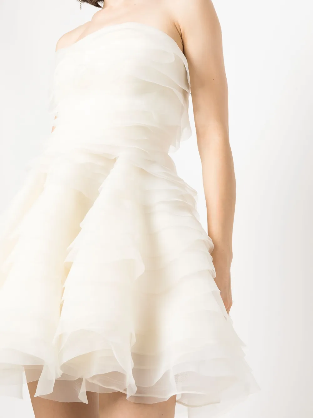 Расцветка Cloud White, органза, многослойный эффект, модель с оборками, без бретелей, перекрестные бретели на спине и длина до бедер.
