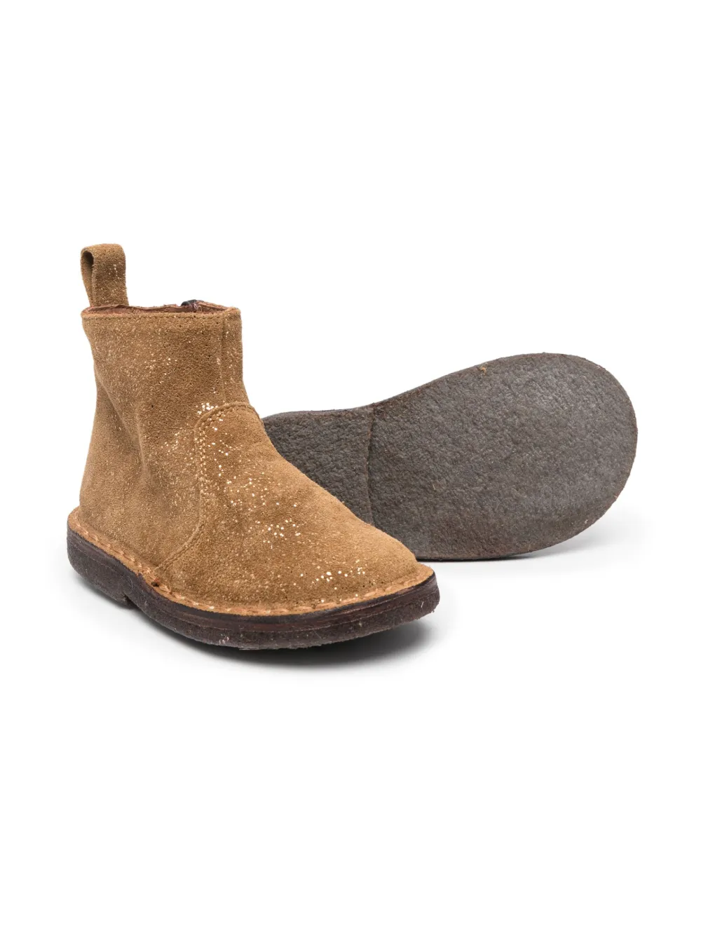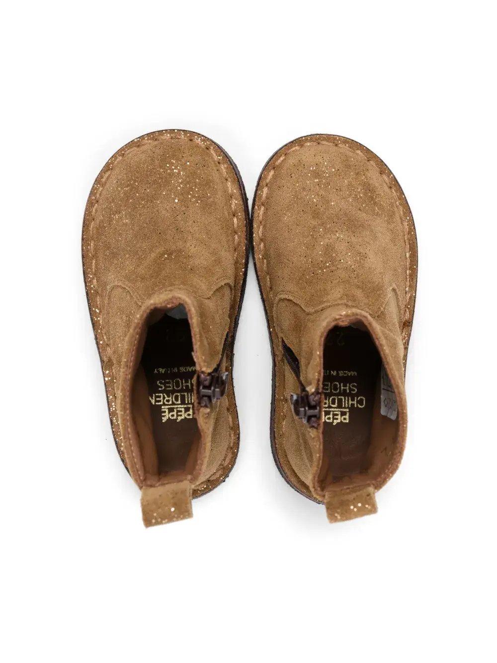 Бежево-коричневый, замша из телячьей кожи, искусственно состаренное покрытие, петля для подтягивания сзади, застежки на молнии сбоку, закругленный носок и резиновая подошва.