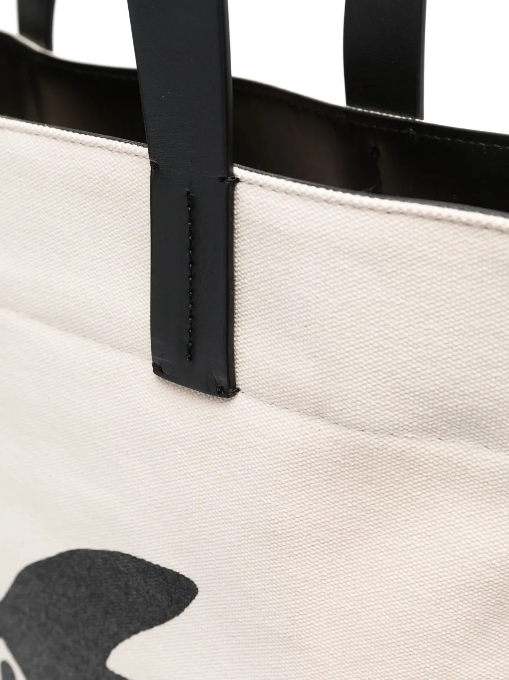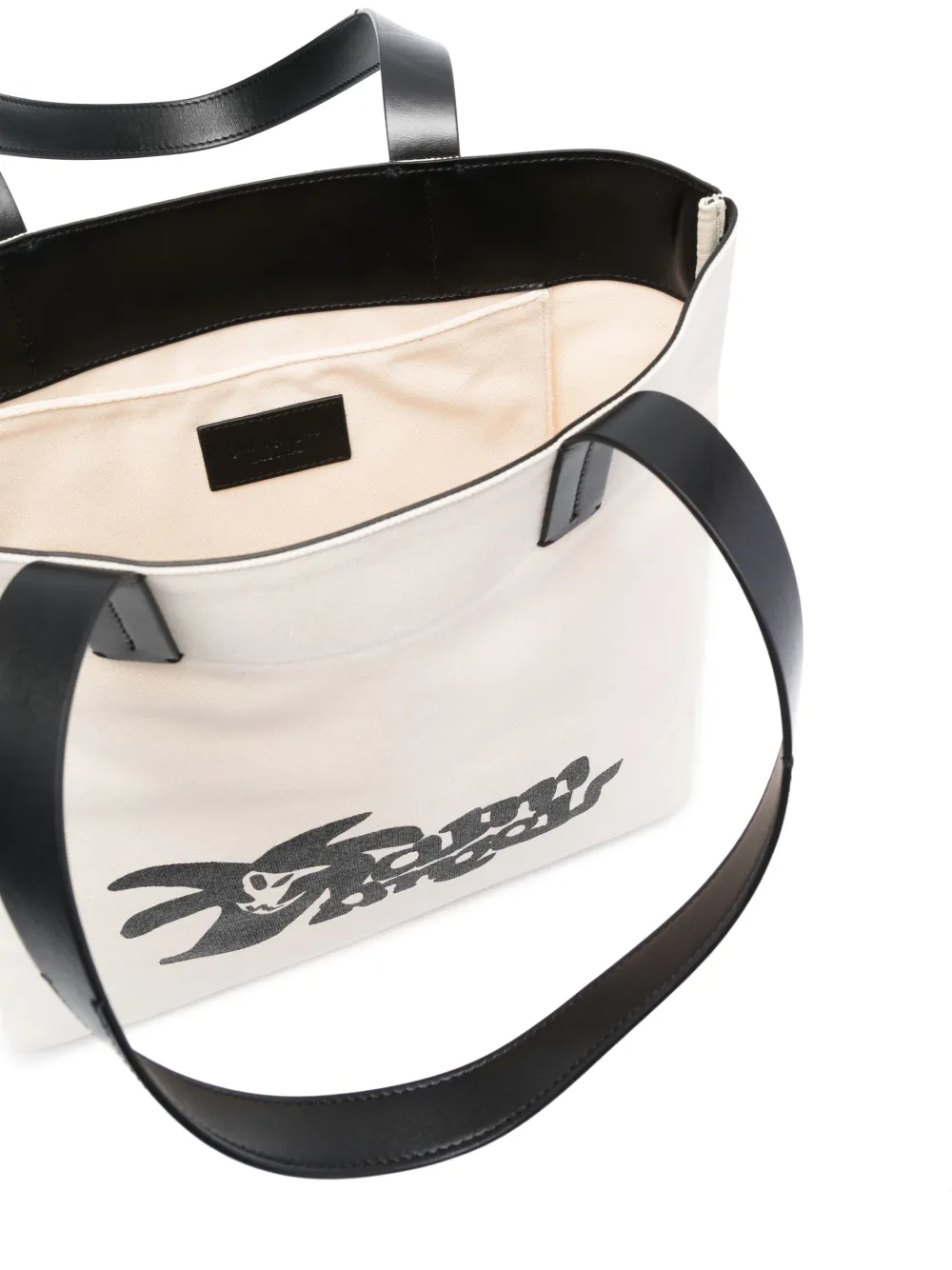 Белый/черный, парусина, логотип спереди, графичный принт на спине, дизайн с открытым верхом, короткие ручки из кожи, нашивка с логотипом внутри и внутренний прорезной карман.