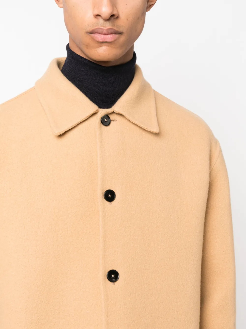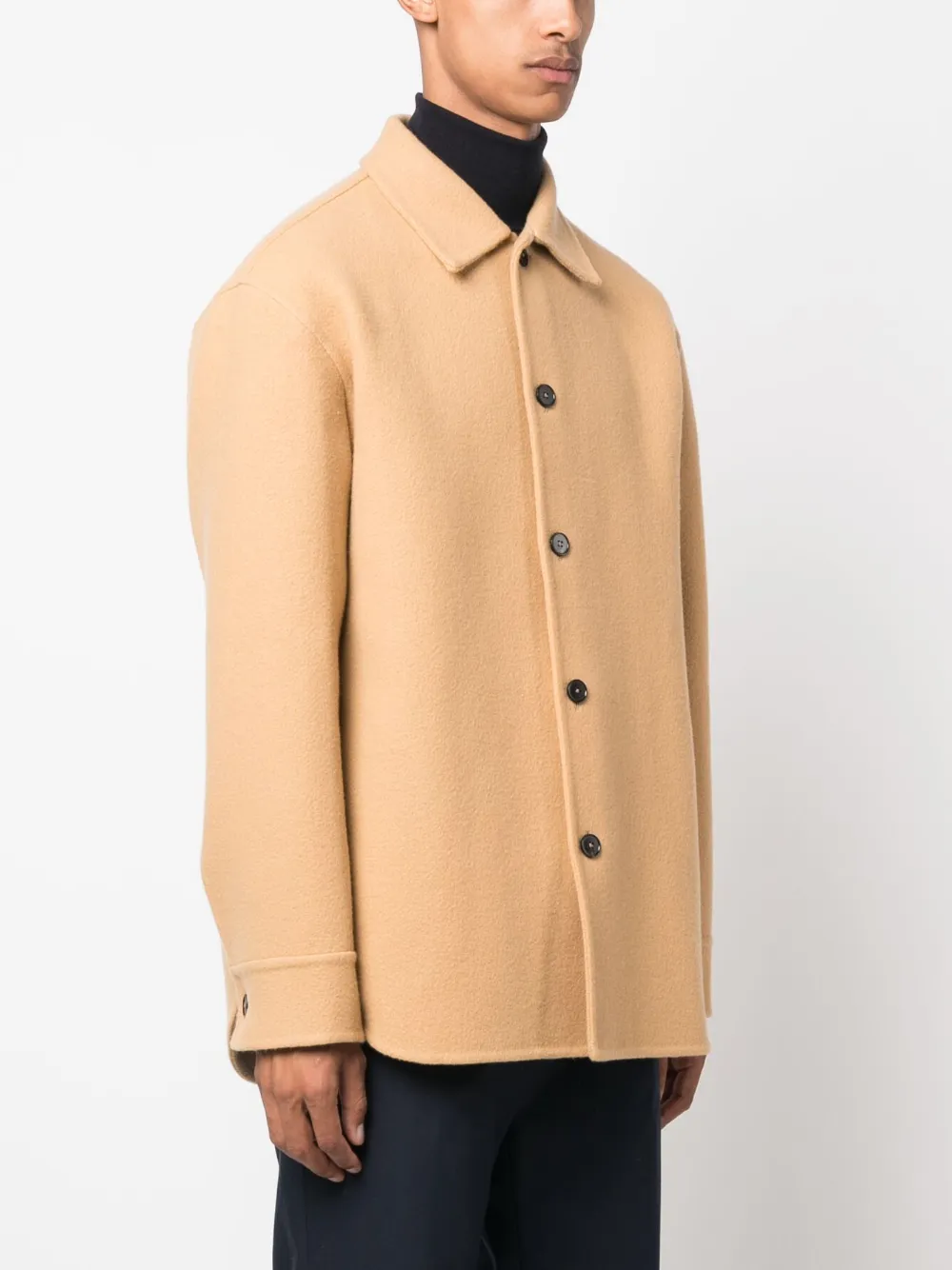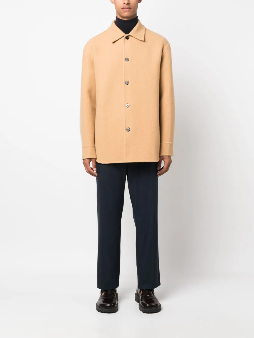 Карамельный, необработанная шерсть, тонкая вязка, классический воротник, застежка на пуговицах спереди, длинные рукава и закругленный подол.