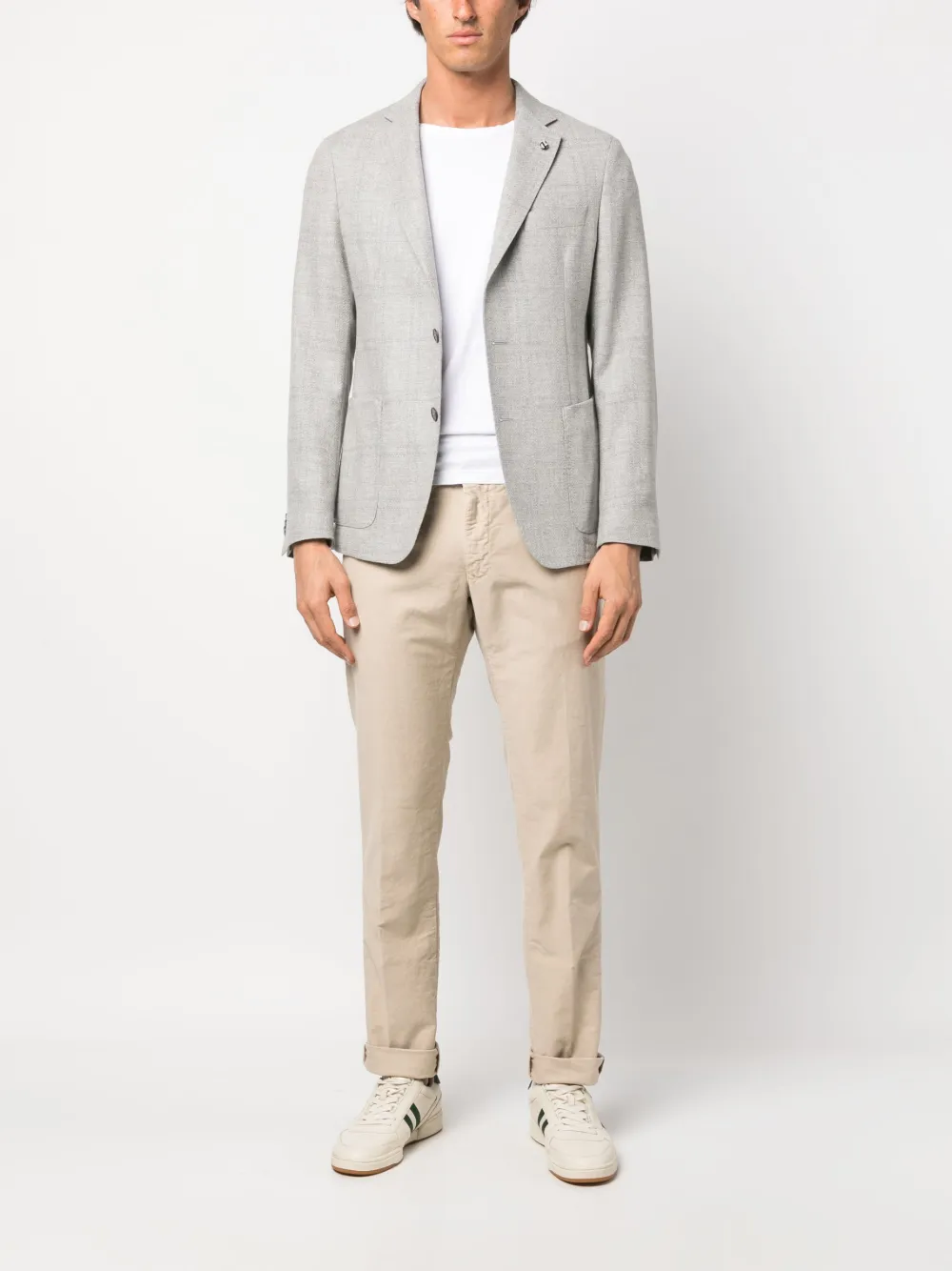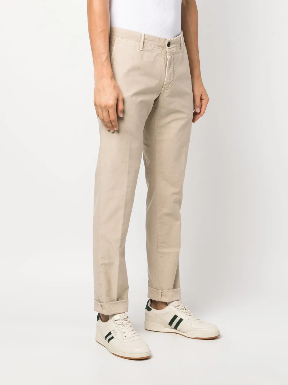 Светло-бежевый, эластичный хлопок, вышитый логотип сзади, петли для ремня, стрелки, два прорезных кармана по бокам, два кармана с листочкой сзади и прямой крой.