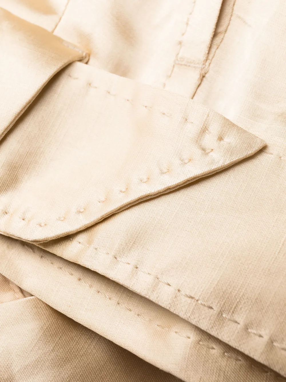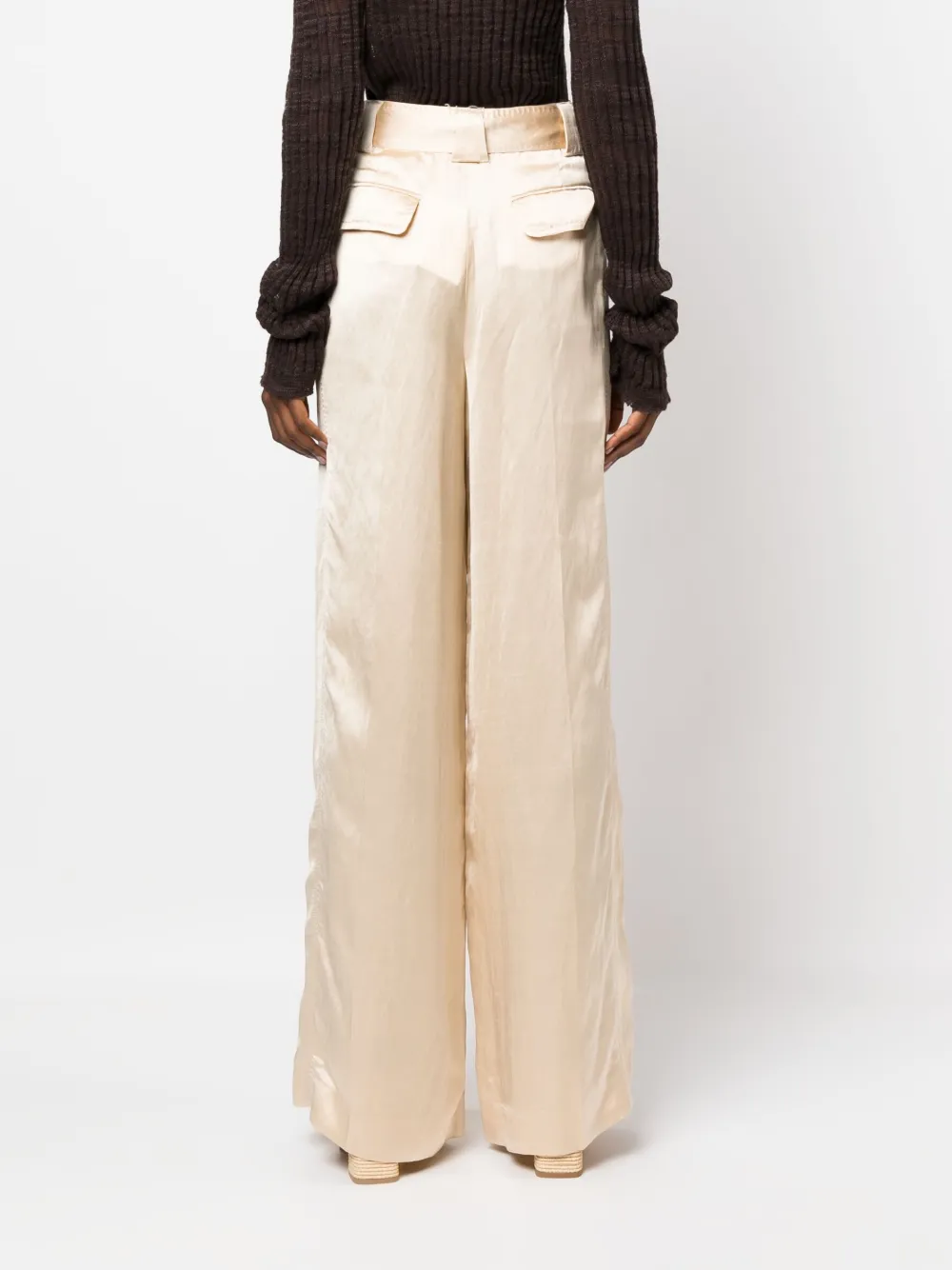 Песочно-бежевый, сатиновая фактура, завышенная линия талии, ремень на талии, два прорезных кармана по бокам, два кармана с клапанами сзади и широкий крой.