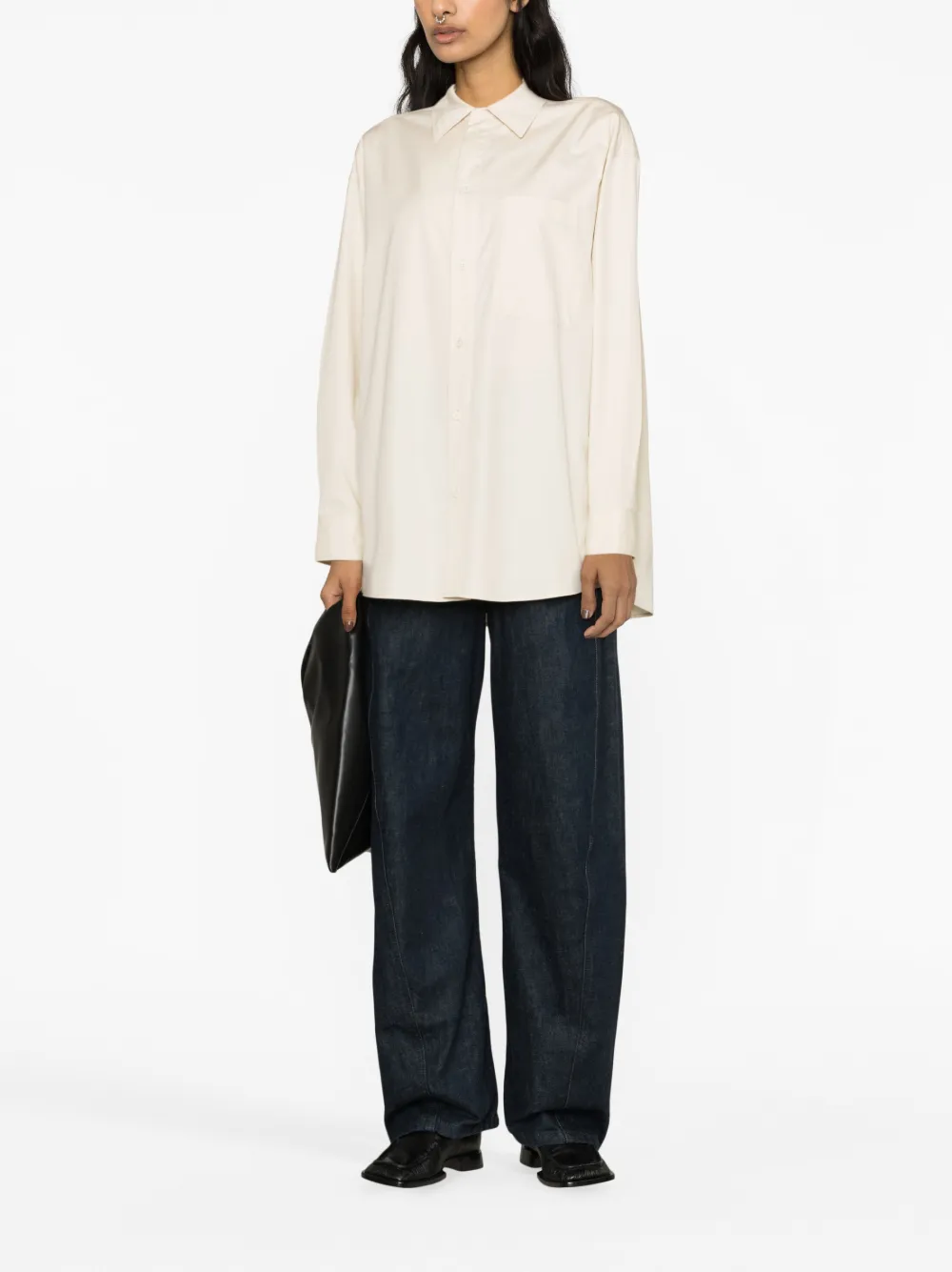 Кремово-белый, хлопок, поплин, модель на запах, классический воротник, застежка на пуговицах спереди, нагрудный накладной карман, приспущенные плечи, длинные рукава, манжеты на пуговицах и закругленный подол.