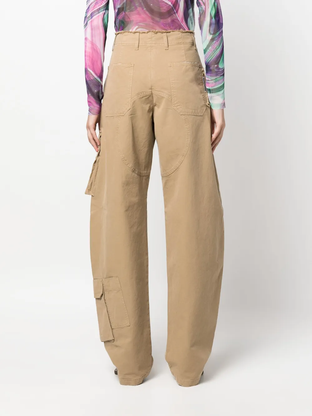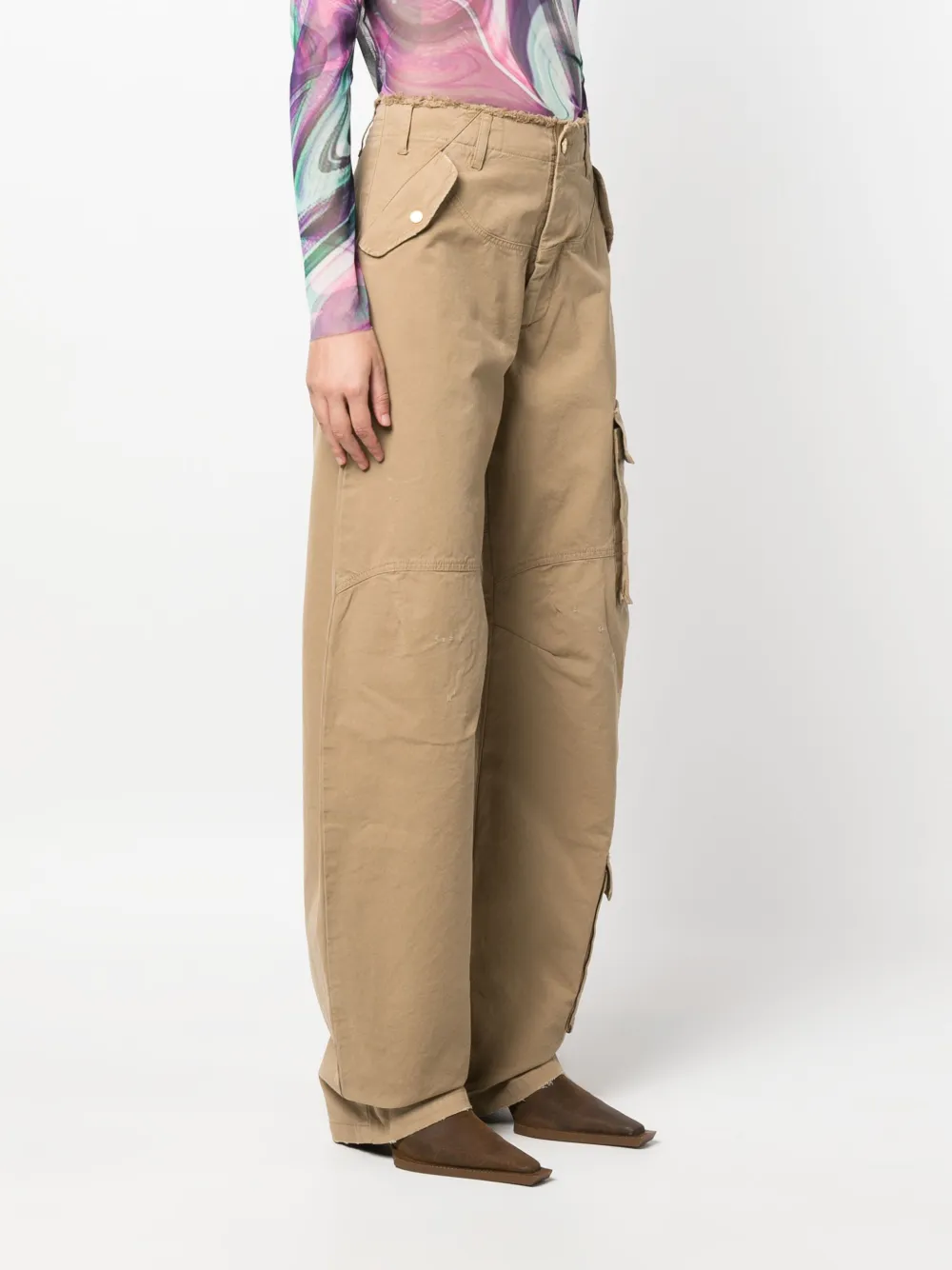 Бежевый, хлопок, деним, необработанные детали, потайная застежка на молнии и пуговицах, два кармана с клапанами по бокам, два накладных кармана по бокам, два накладных кармана сзади, петли для ремня, широкий крой и прямой подол.