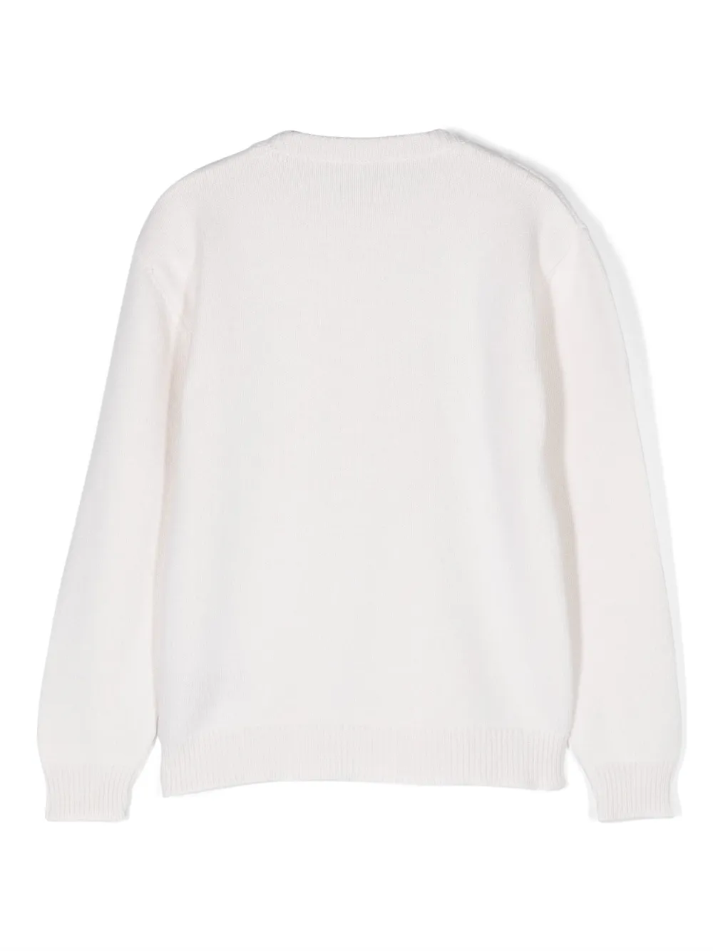 Кремово-белый, смесовая шерсть мериноса, трикотажный материал, вышитый логотип спереди, длинные рукава и круглый вырез.