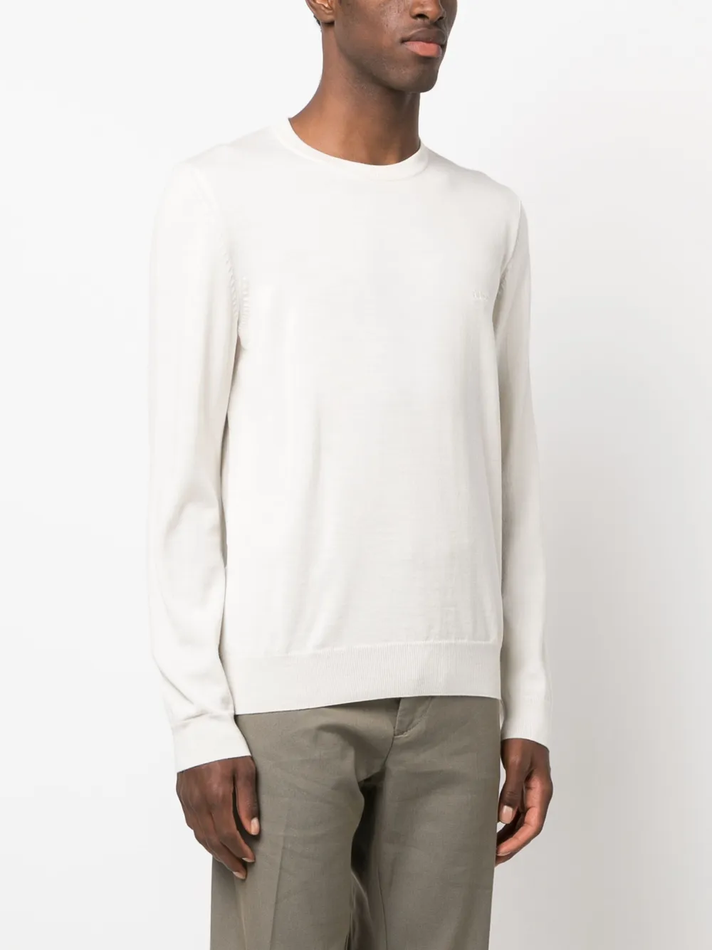 Цвет слоновой кости, необработанная шерсть, тонкая вязка, вышитый логотип на груди, круглый вырез и длинные рукава.