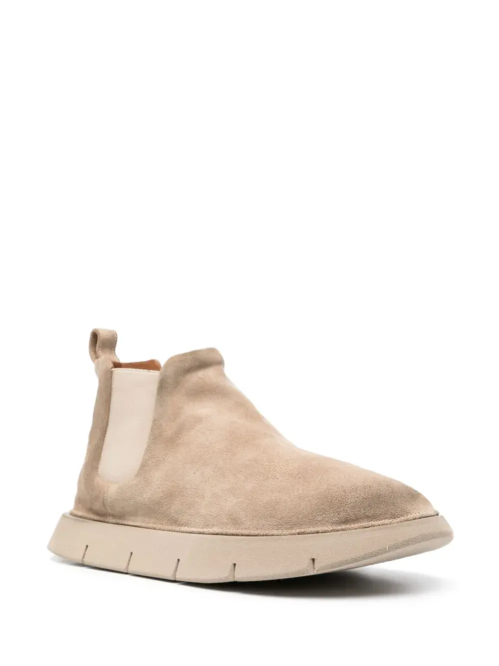 Светло-бежевый, замша из телячьей кожи, петля для подтягивания сзади, модель без застежки, эластичные манжеты, рифленая резиновая подошва и закругленный носок.