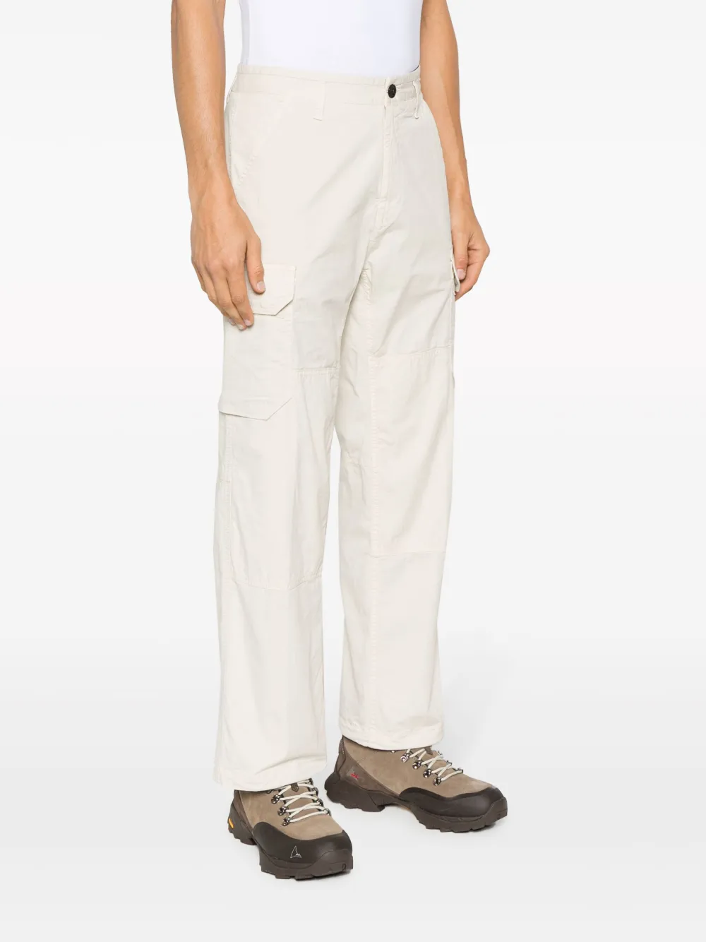 Кремовый, эластичный хлопок, съемный значок Compass, завышенная талия, петли для ремня, застежка на пуговицах спереди, два накладных кармана по бокам, два вшитых кармана по бокам, два кармана с клапанами сзади и прямой крой.