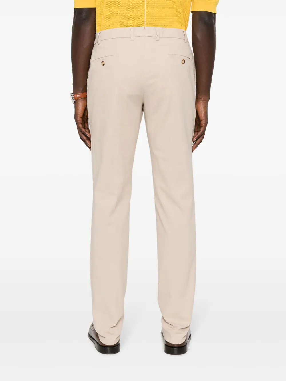 Расцветка Sesame Beige, эластичный хлопок, петли для ремня, средняя посадка, узкий крой, смещенная застежка на пуговицах спереди, два вшитых кармана по бокам и два кармана с листочкой сзади.
