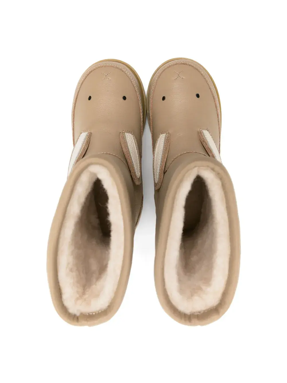 Серо-бежевый, телячья кожа, подкладка из овечьей шерсти, объемная аппликация, петля для подтягивания сзади, тисненый логотип сзади, закругленный носок, модель без застежки, высота по щиколотку, плоская подошва и резиновая подошва.