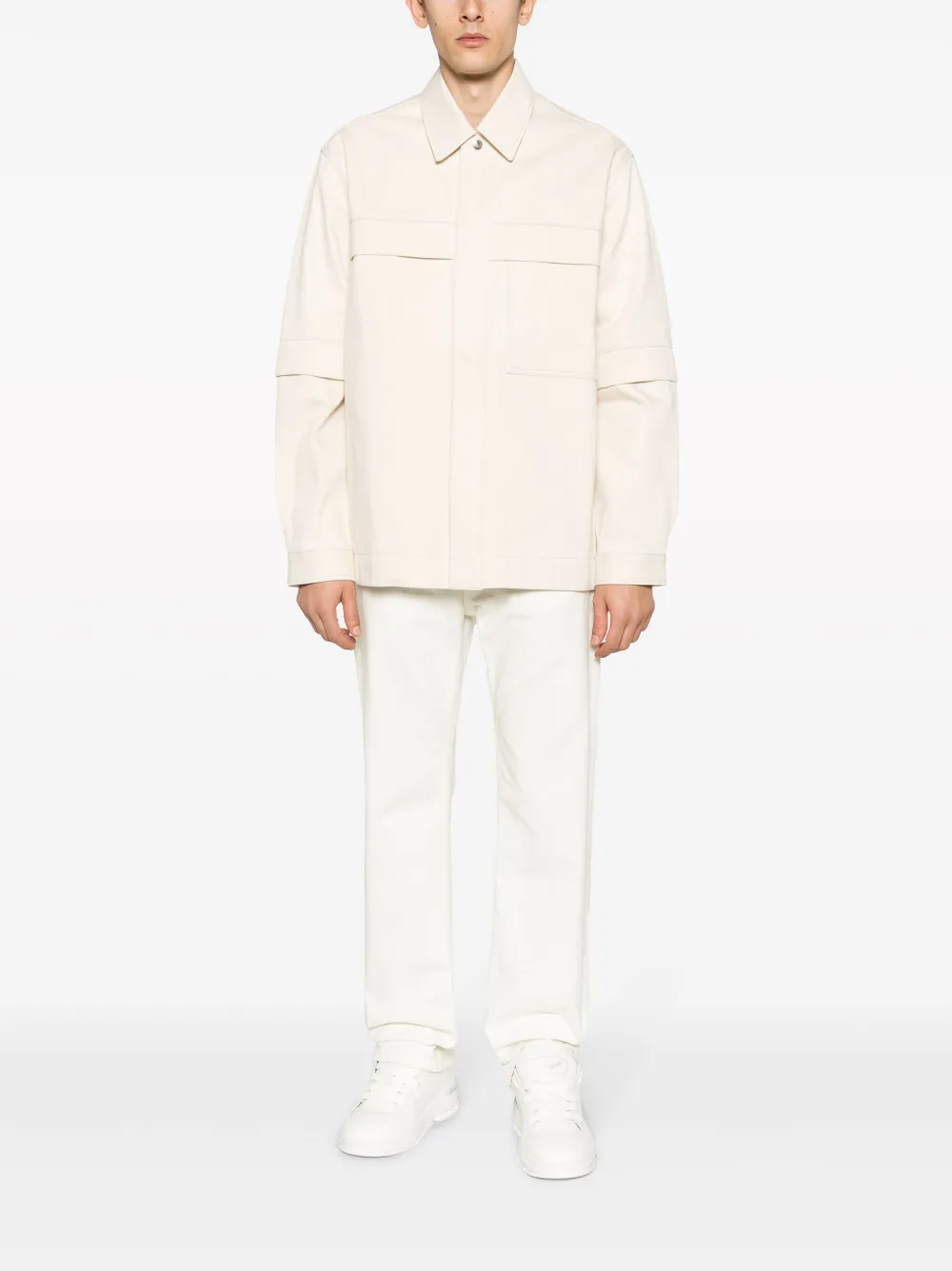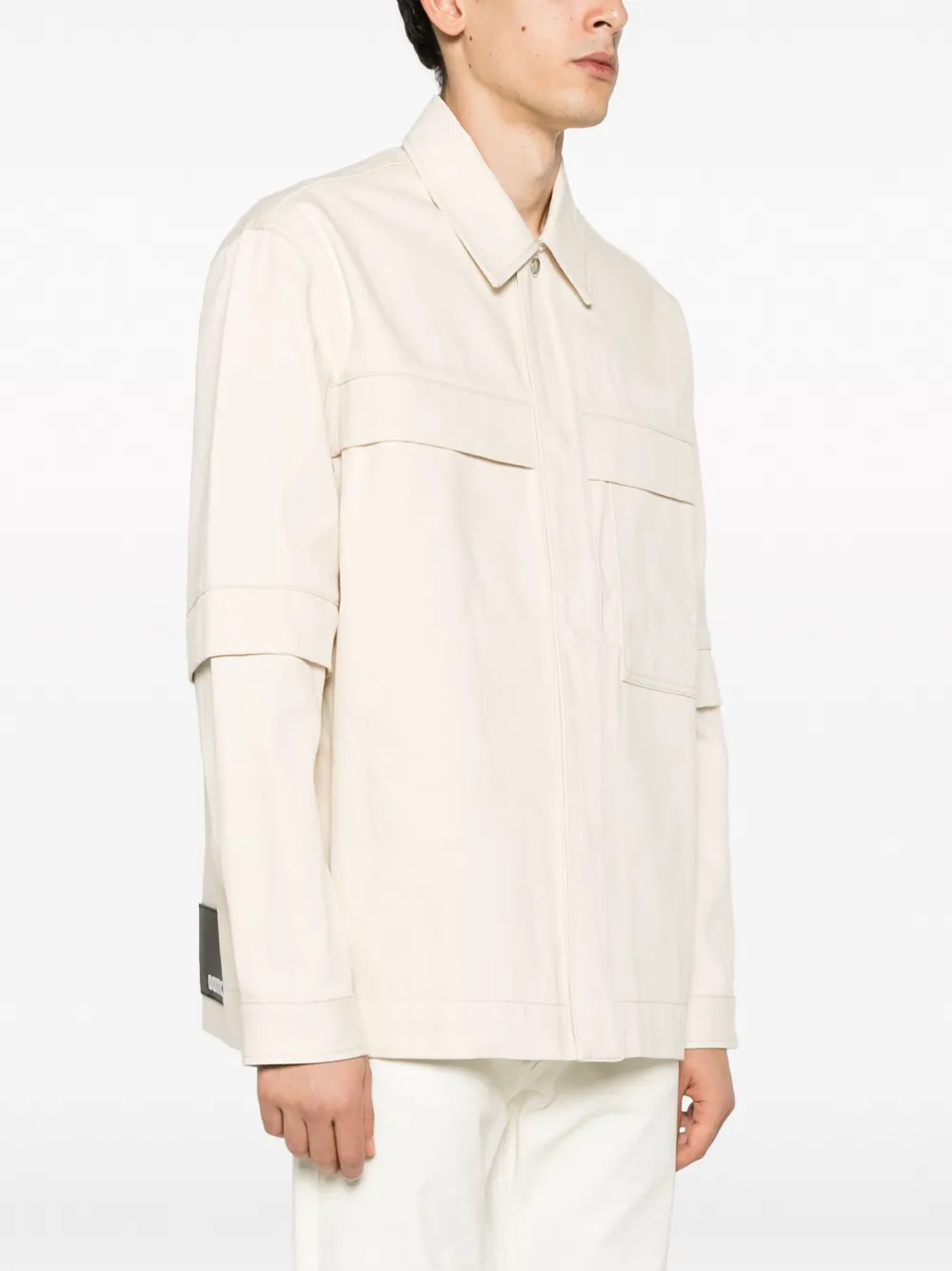 Светло-бежевый, хлопок, нашивка-логотип из искусственной кожи, плоский заостренный воротник, потайная застежка спереди, верхний слой с короткими рукавами, длинные рукава, манжеты с застежкой на кнопки, два нагрудных кармана с клапанами и прямой подол.