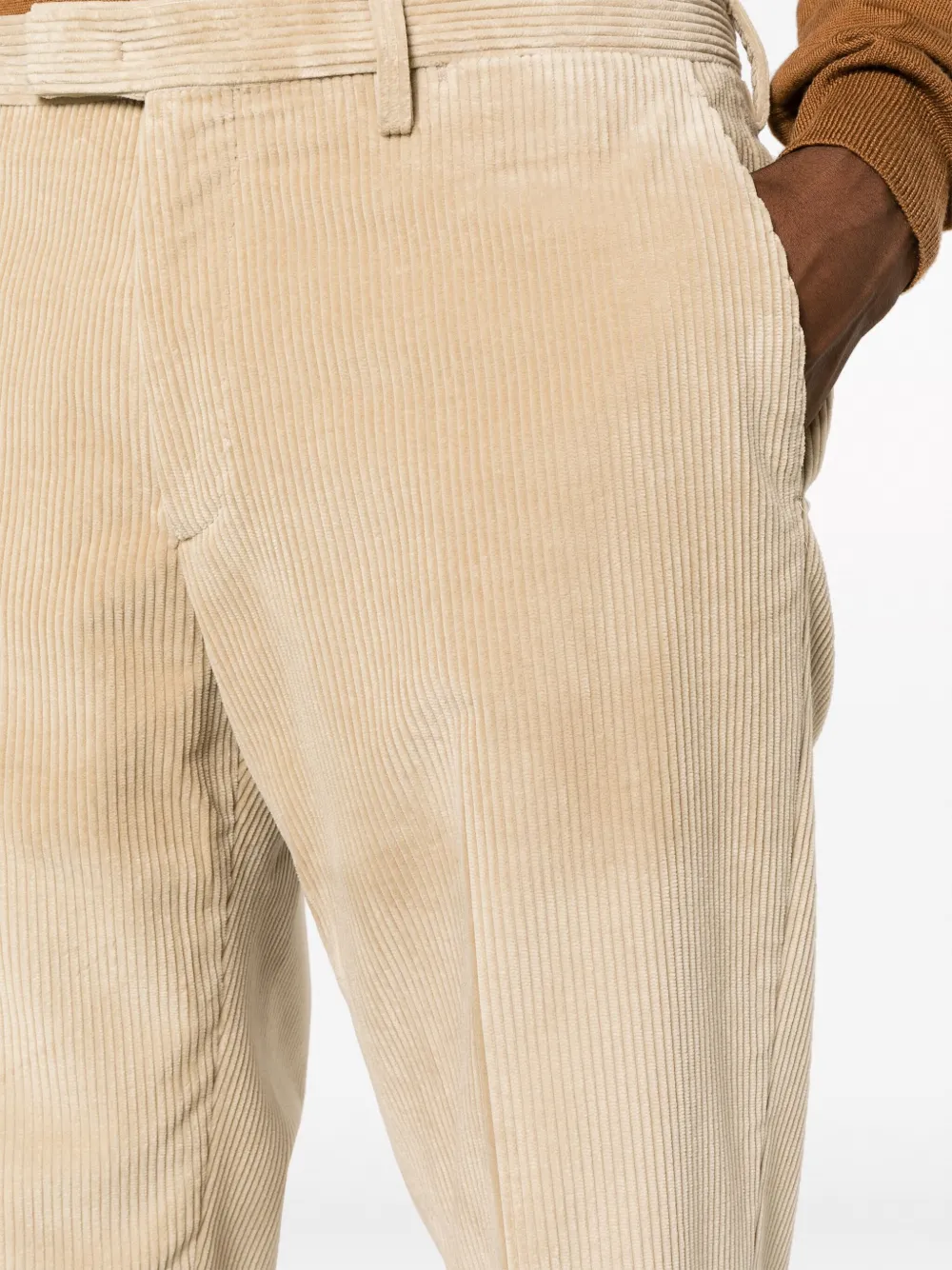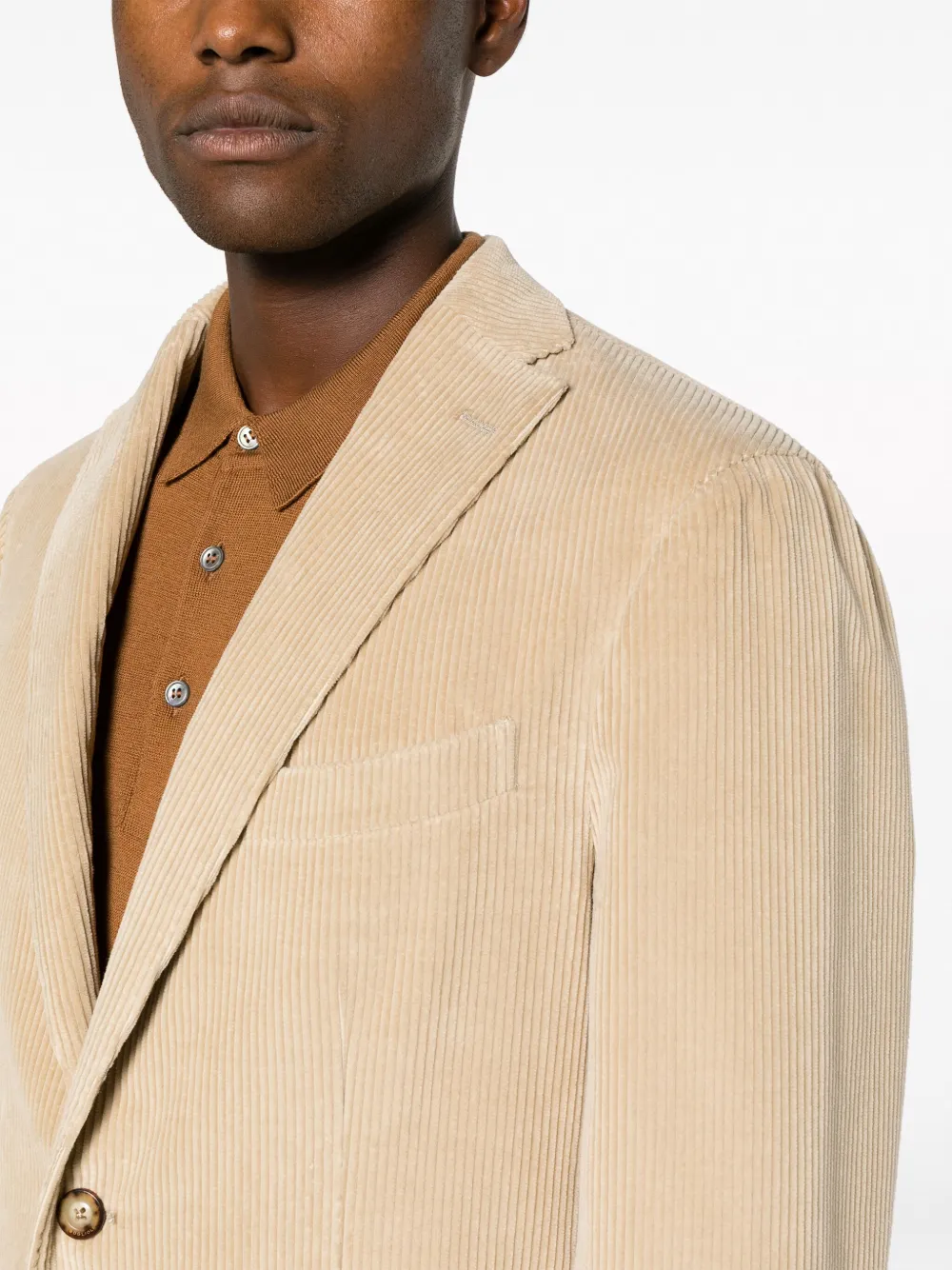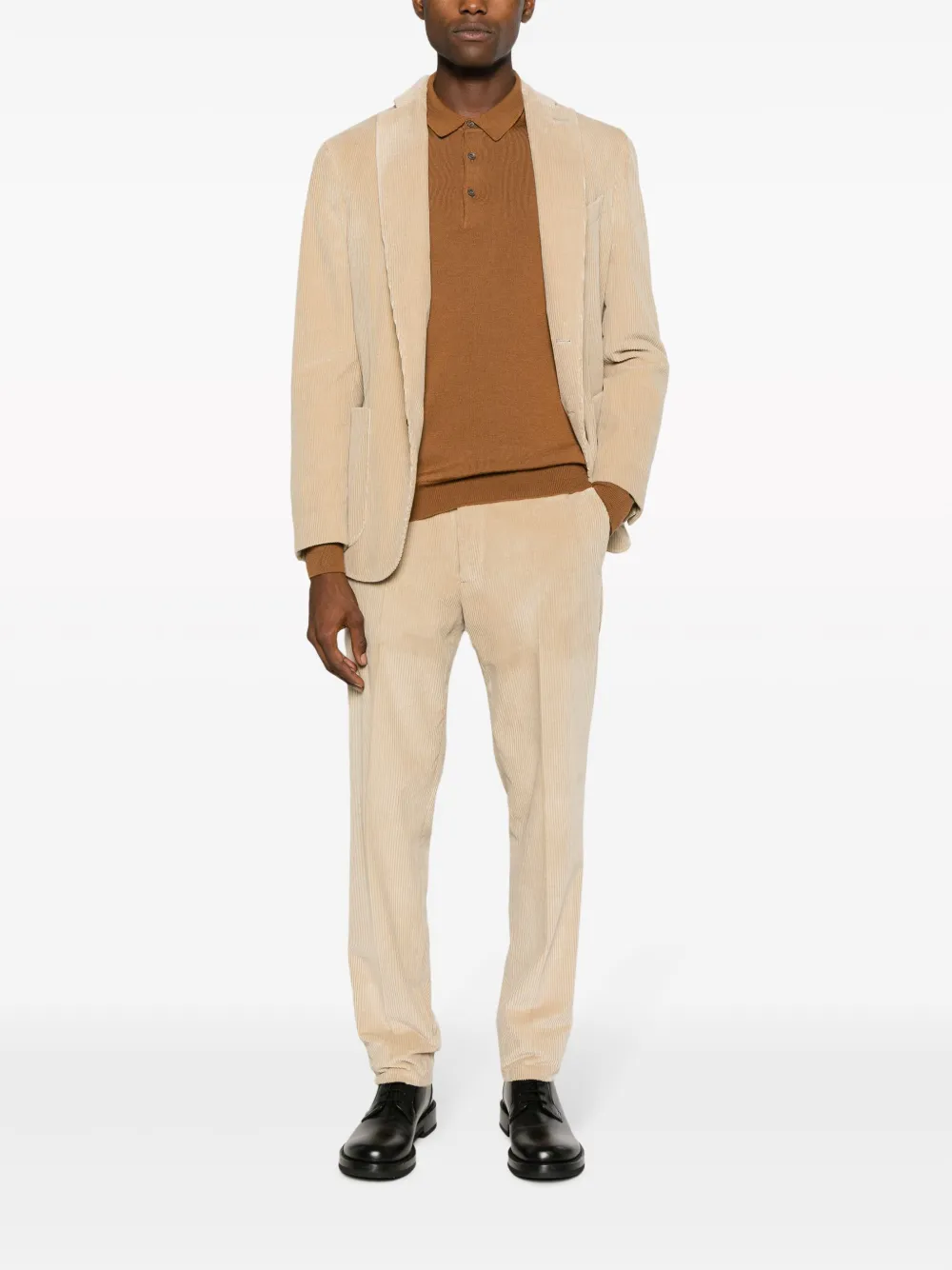 Песочно-бежевый, хлопок, вельветовый материал, зазубренные лацканы, застежка на пуговицах спереди, подплечники, длинные рукава, манжеты на пуговицах, прорезной карман на груди, два накладных кармана спереди, две боковые шлицы сзади, прямой крой, петли для ремня, стрелки, потайная застежка спереди, два прорезных кармана по бокам и два прорезных кармана сзади.