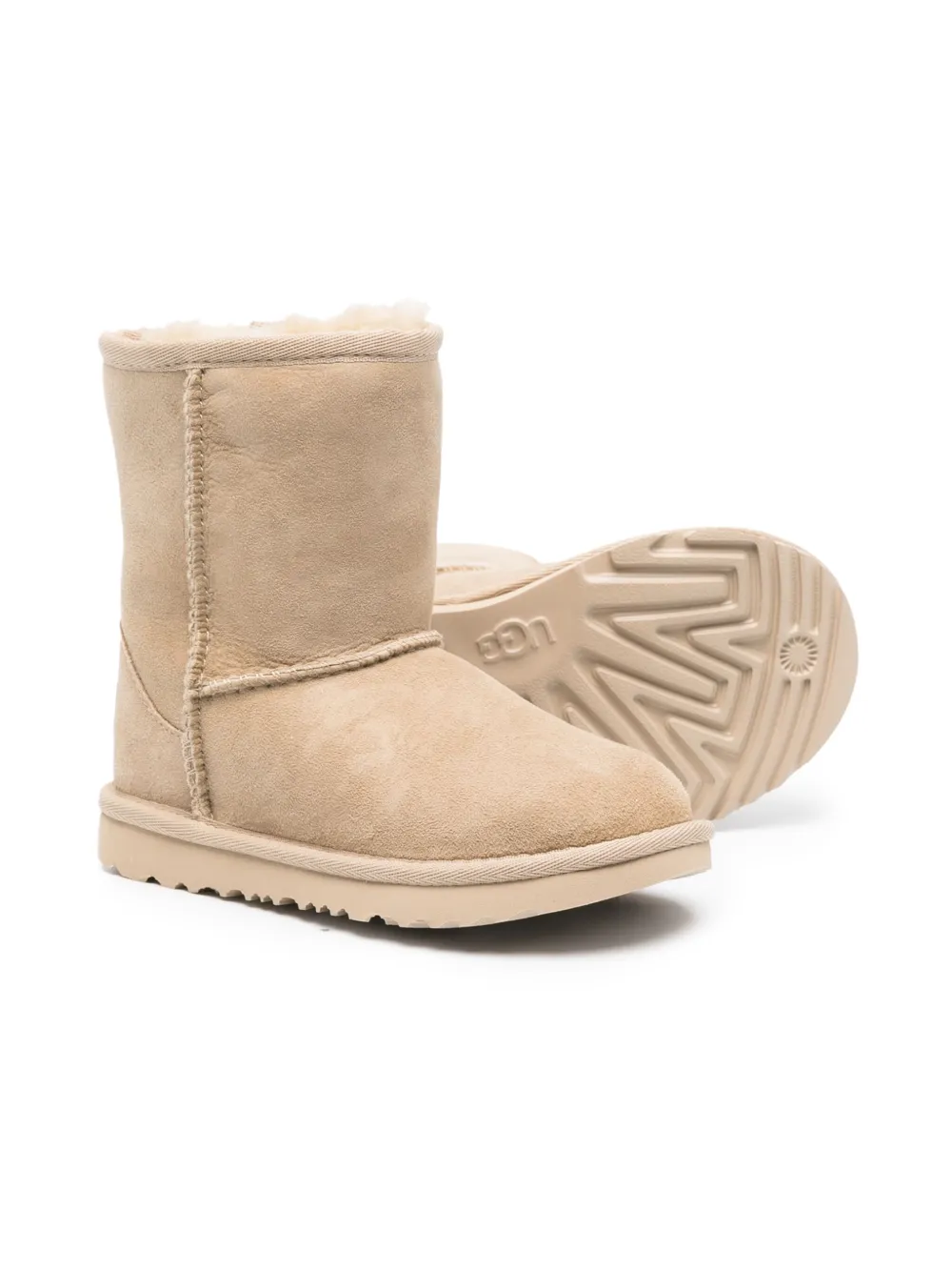 Светло-бежевый, замша, подкладка из шерпы, нашивка с логотипом сзади, закругленный носок, модель без застежки и плоская резиновая подошва.