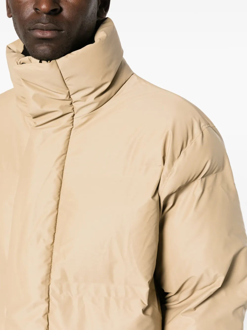 Песочно-бежевый, дутый материал, стеганая модель, воротник-труба, длинные рукава и прямой подол. Это унисекс-модель. Обратите внимание, что для нее используется мужская размерная сетка. . Узнать больше о том, какие товары получают отметку «Ответственный выбор», можно из материала «Как мы оцениваем экологичность и этичность».