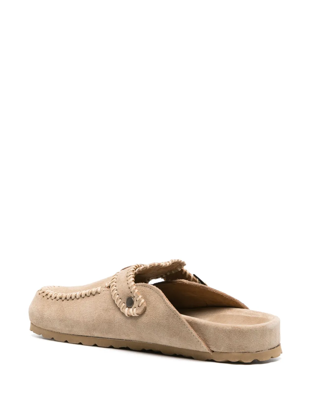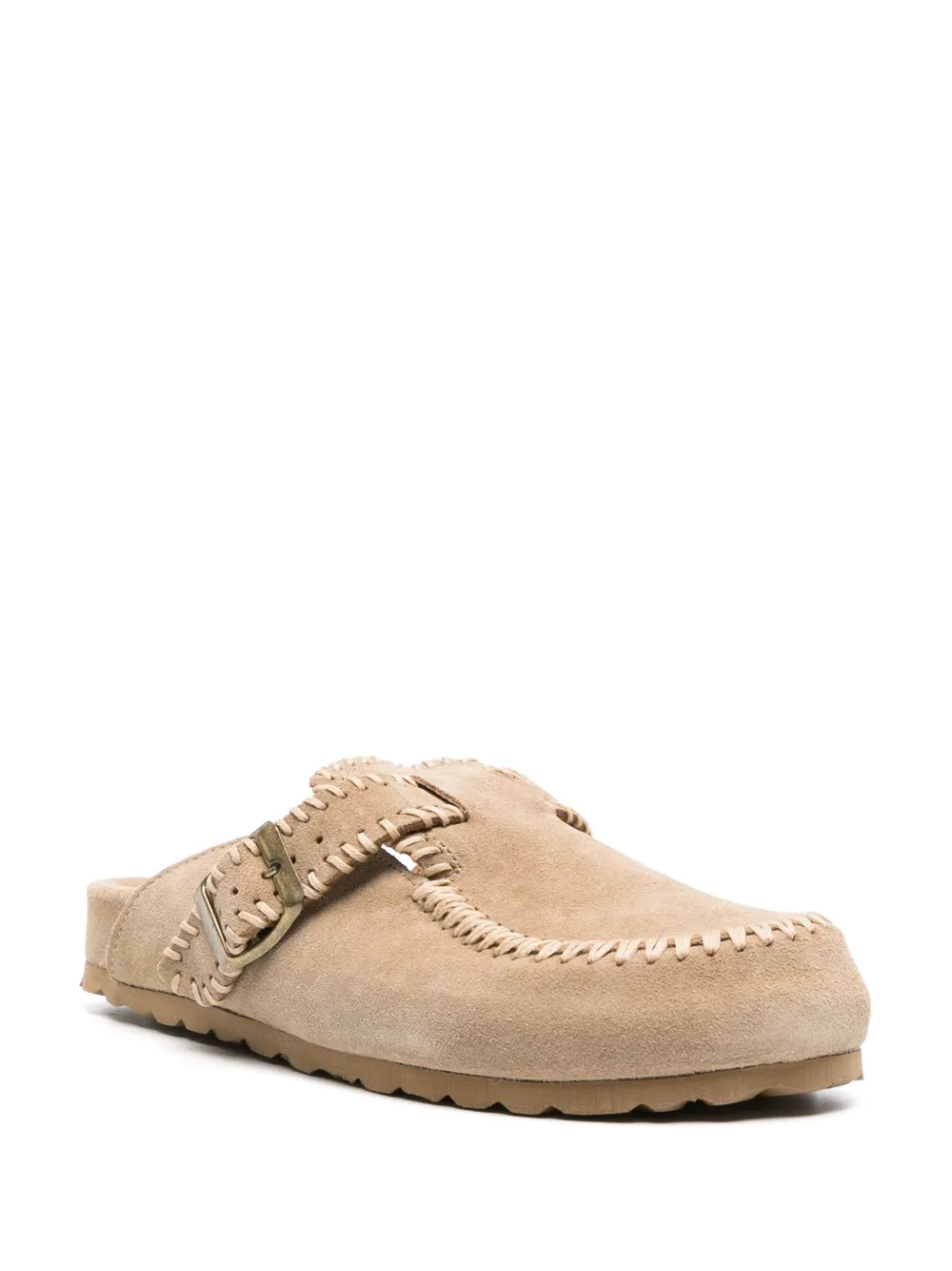 Бежевый, замша из телячьей кожи, обметочный шов, боковые застежки с пряжками, закругленный носок, модель без застежки, стелька с логотипом и плоская резиновая подошва.