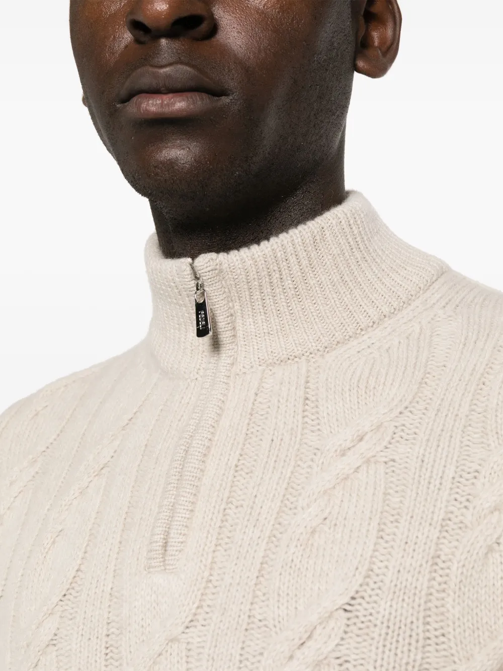 Песочно-бежевый, смесь шерсти и кашемира, трикотажный материал, крупная вязка, высокий воротник, короткая застежка на молнии спереди, длинные рукава и прямой подол.