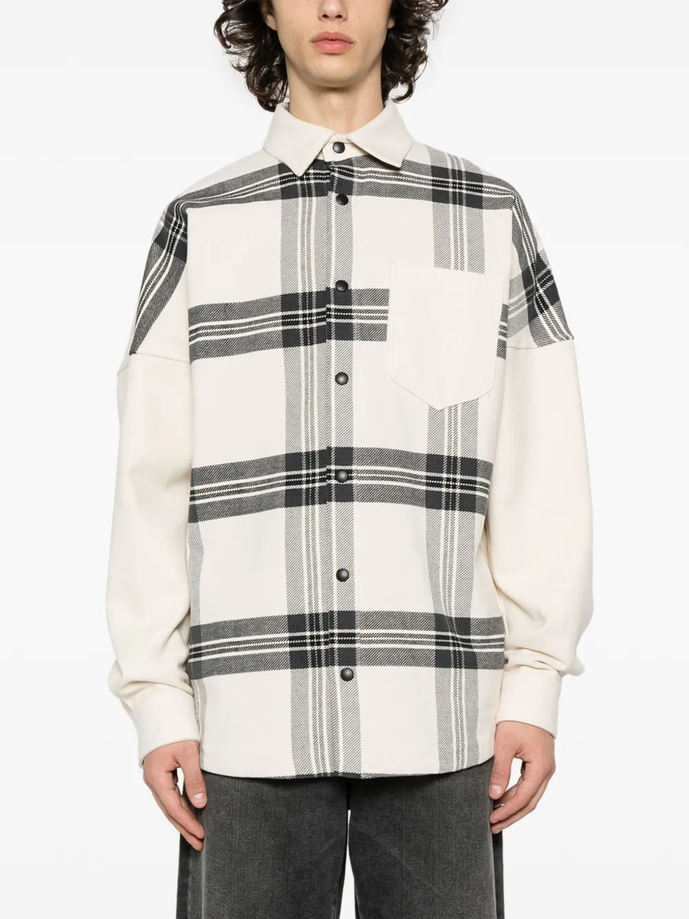 Подробнее о товаре: • оттенок слоновой кости, антрацитовый серый • хлопок • плетение интерлок • фланель • тональная строчка • дизайн колор-блок • клетчатый узор • классический воротник • заниженная линия плеч • длинные рукава • манжеты с застежкой на кнопки • нагрудный накладной карман • закругленный подол • вышитый логотип • модель без подкладки • застежка на кнопках спереди