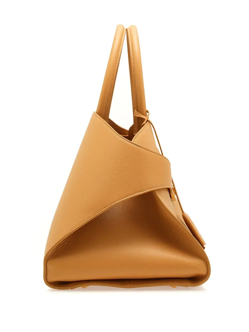 Карамельный, кожа, золотистая фурнитура, логотип спереди, две закругленные верхние ручки, дизайн с открытым верхом, основное отделение и металлические ножки.