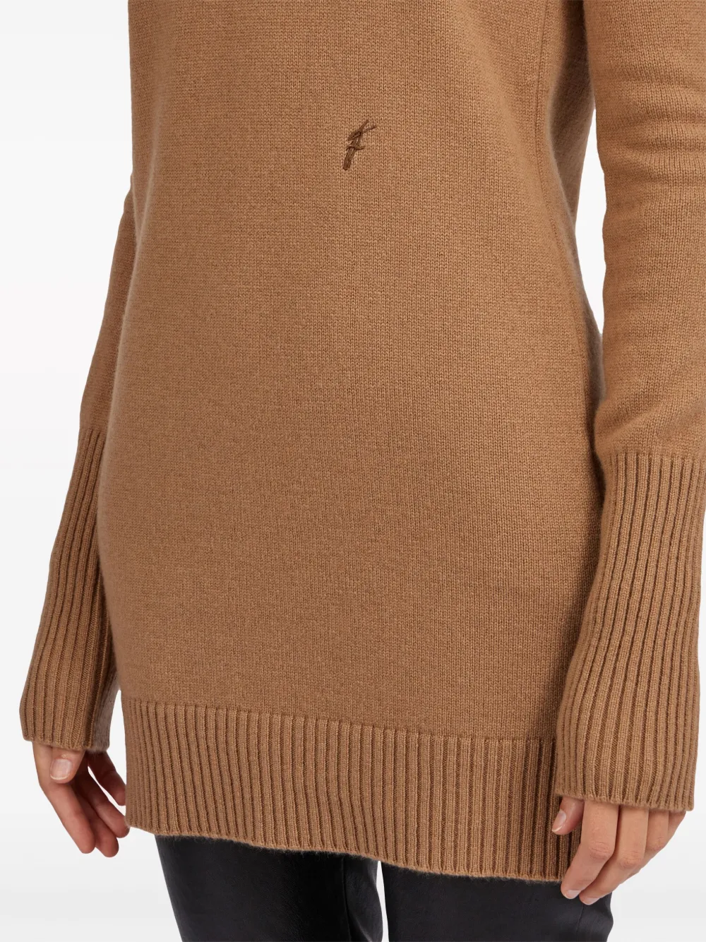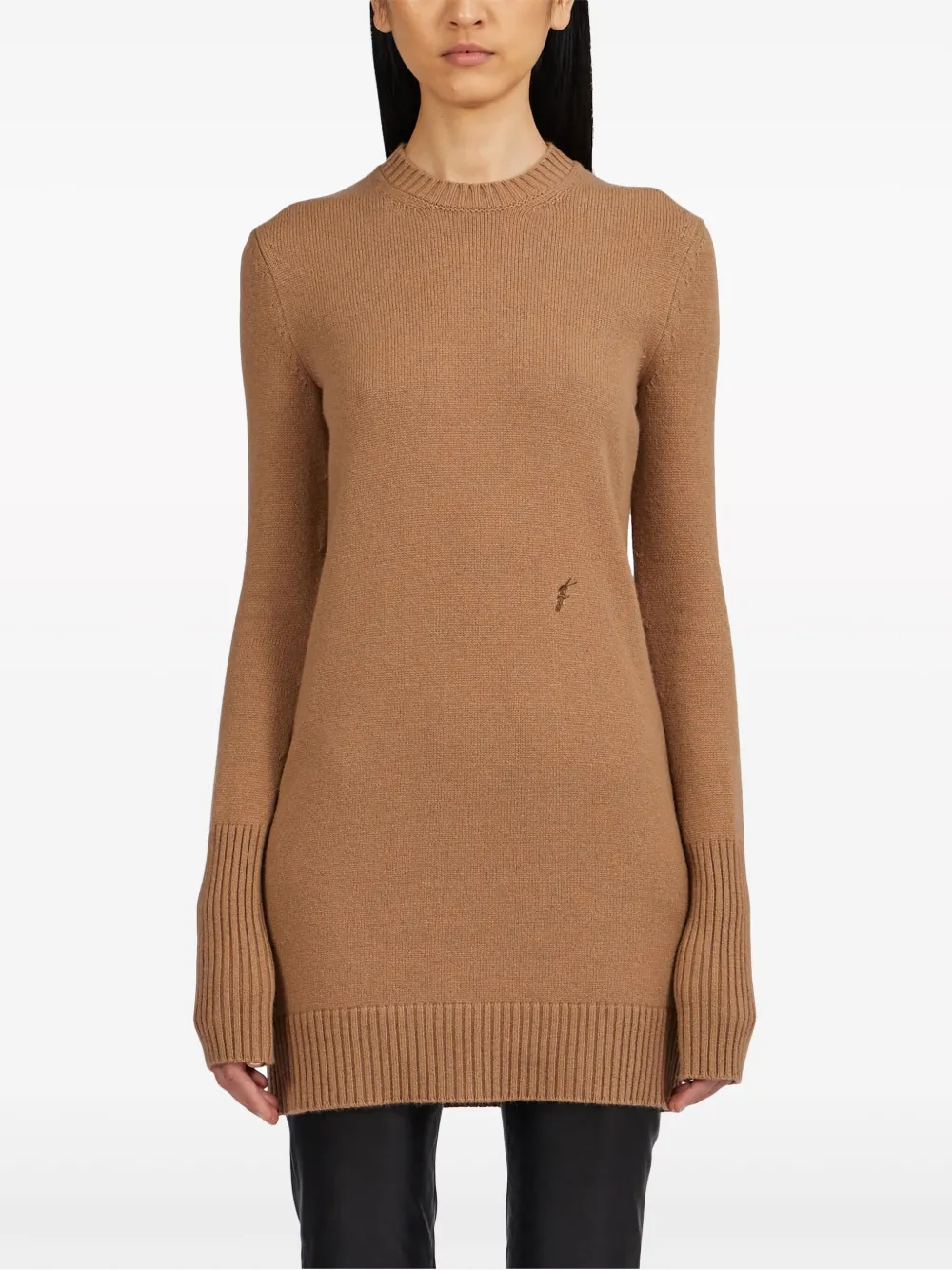 Это мягкое и роскошное мини-платье из чистого кашемира с небольшой вышитой буквой F в тон спереди. Его современный вид подчеркивают ребристая вязка с круглым вырезом и длинные манжеты. Это практичное и удобное изделие станет незаменимым аксессуаром для отдыха на долгие сезоны.