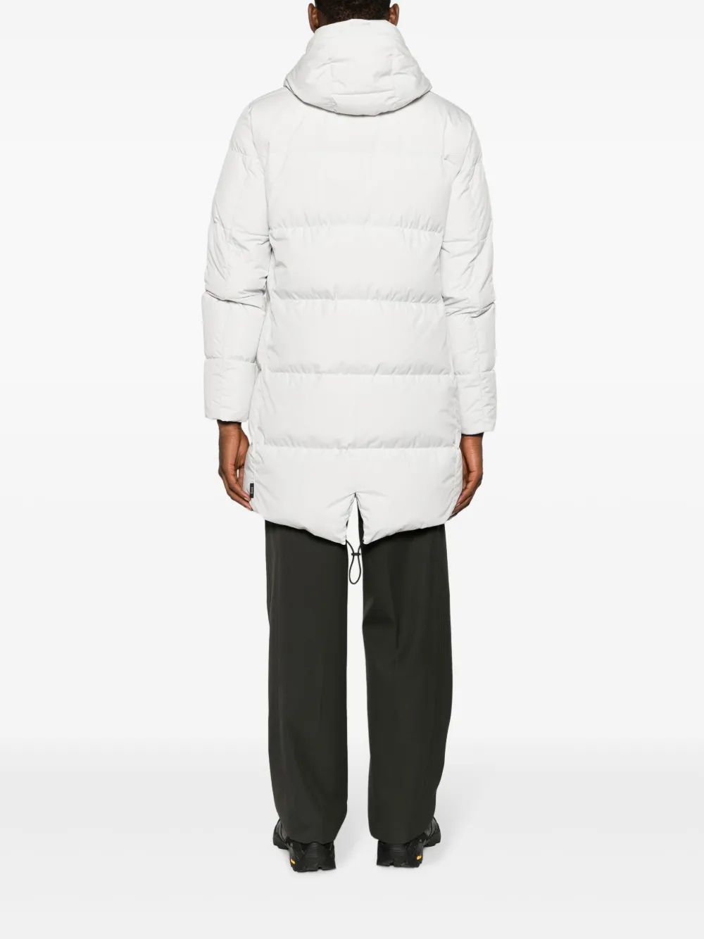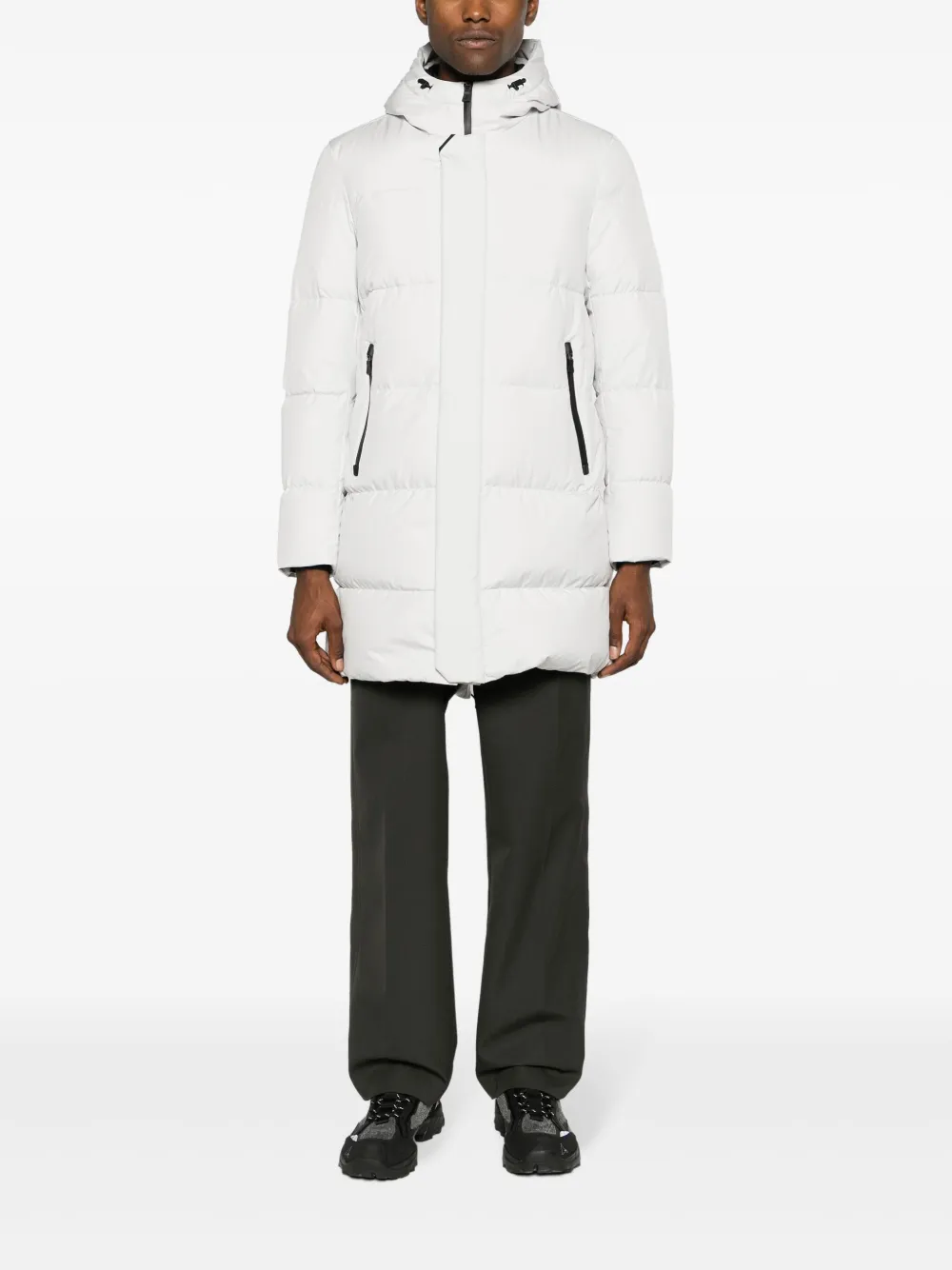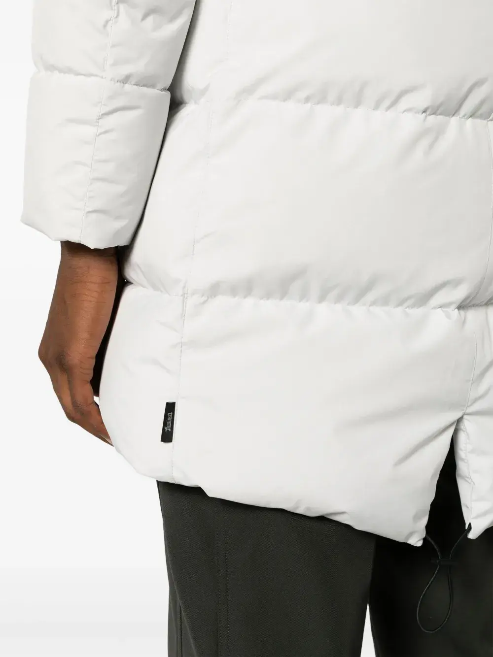 Молочно-белый, наполнитель из пуха и перьев, дутый материал, стеганая модель, воротник-труба, затягивающийся на шнурок капюшон, потайная застежка на молнии и пуговицах, длинные рукава, два кармана на молнии по бокам, длина до бедер и прямой подол.